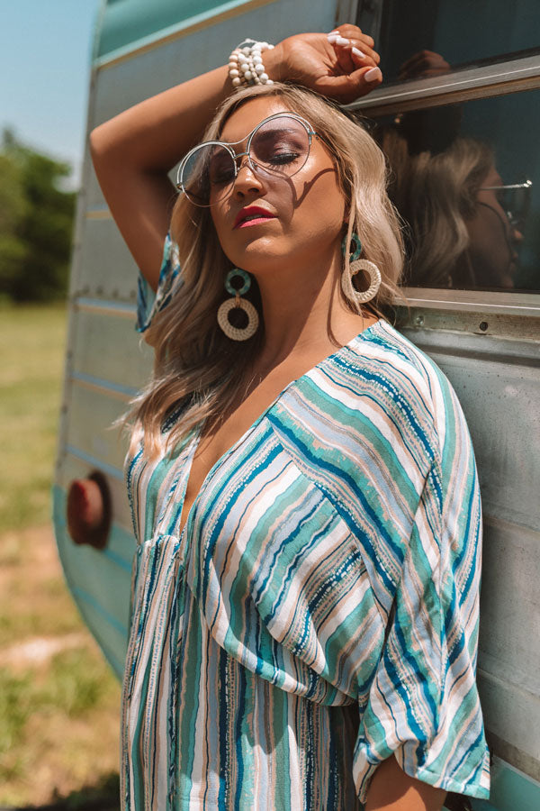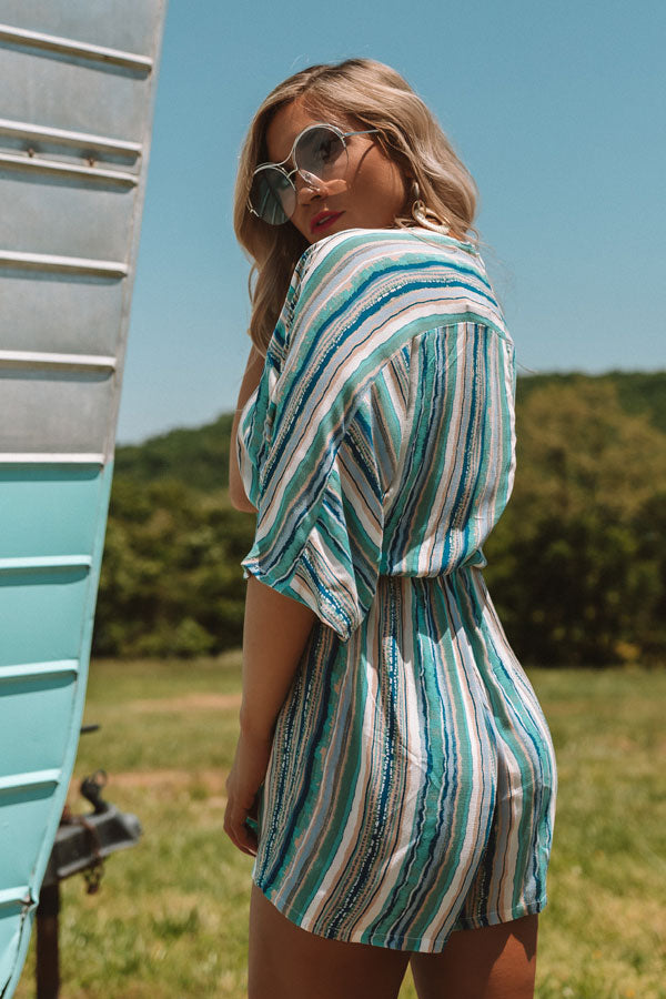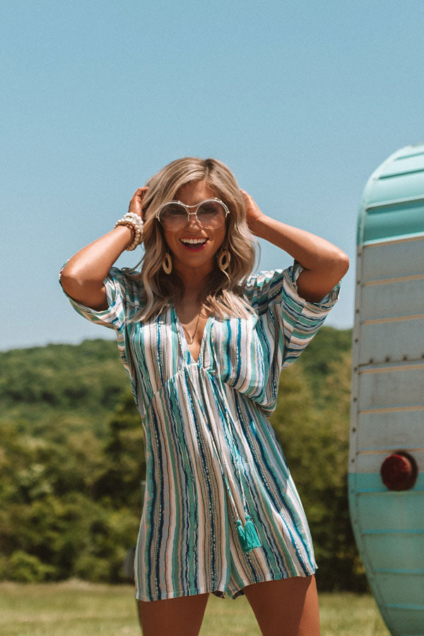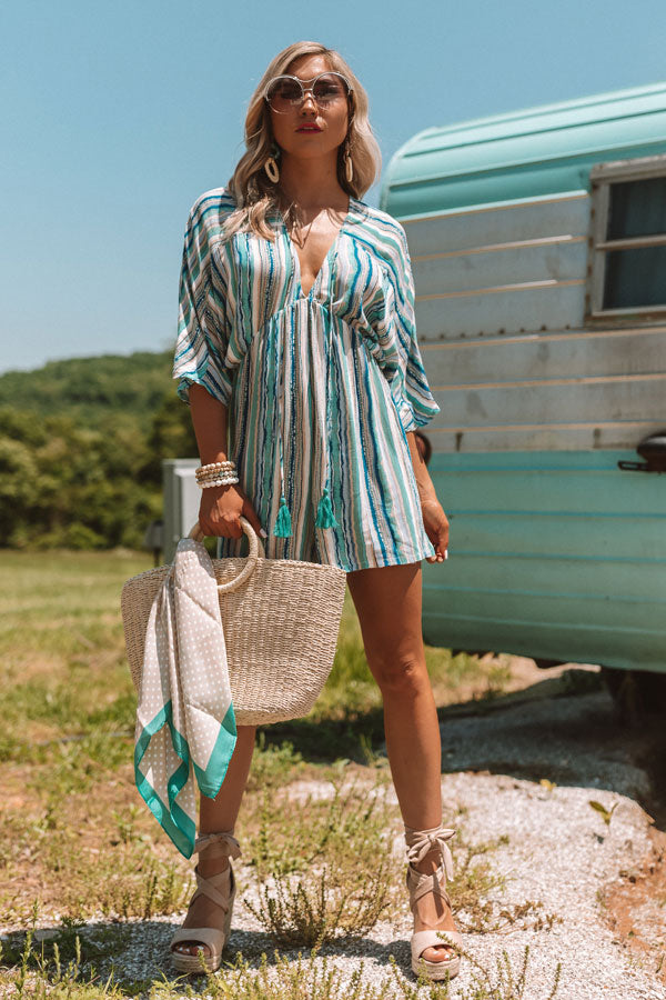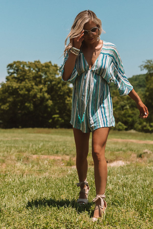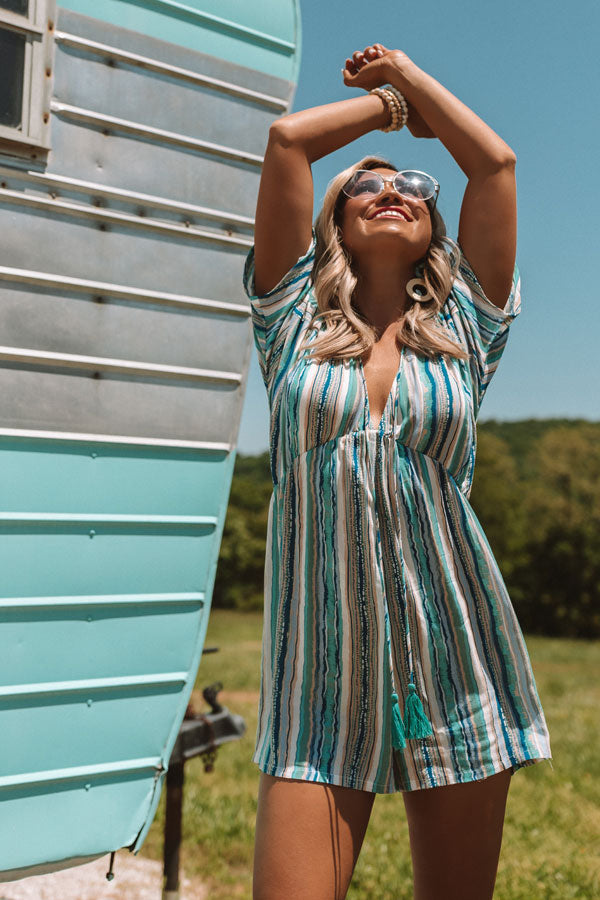 This striped piece looks as though it might be a dress due to the missing waistline, but don't be fooled, it is actually a stylish romper! Its flawless blue color scheme is perfect for a bold summer look and the tassel strings add some flare! It has a zip up back and v-neckline allowing you to pair it with some beautiful statement jewelry. Measurements