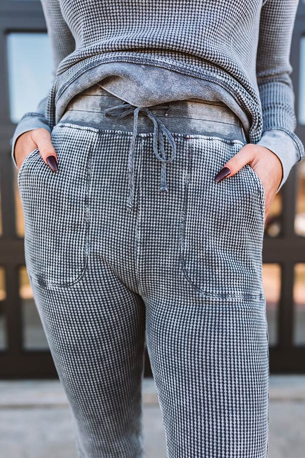 We have no doubt you will LOVE these casual charcoal colored leisure joggers featuring soft lightweight material with waffle knit texturing, a wide elastic waistline with a tie belt, two front pockets, dark accent seams, and a flattering pants silhouette that tapers into fitted ankle-length hemlines! Measurements