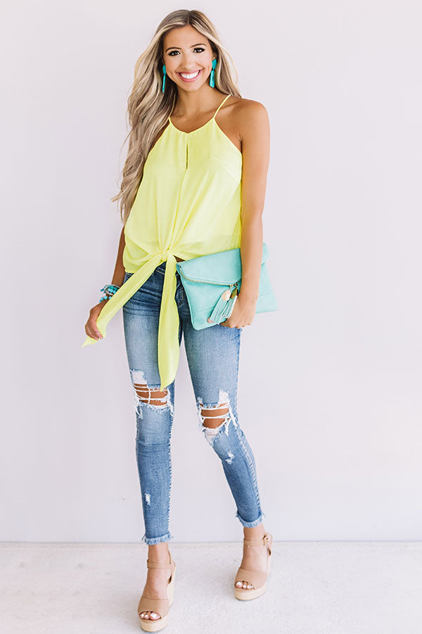 Be your best self in this yellow tie tank with its spaghetti straps and front keyhole cutout! Pair this vibrant piece with some distressed skinnies, neutral wedges, and a bright summer clutch then go grab yourself a limoncello! Measurements