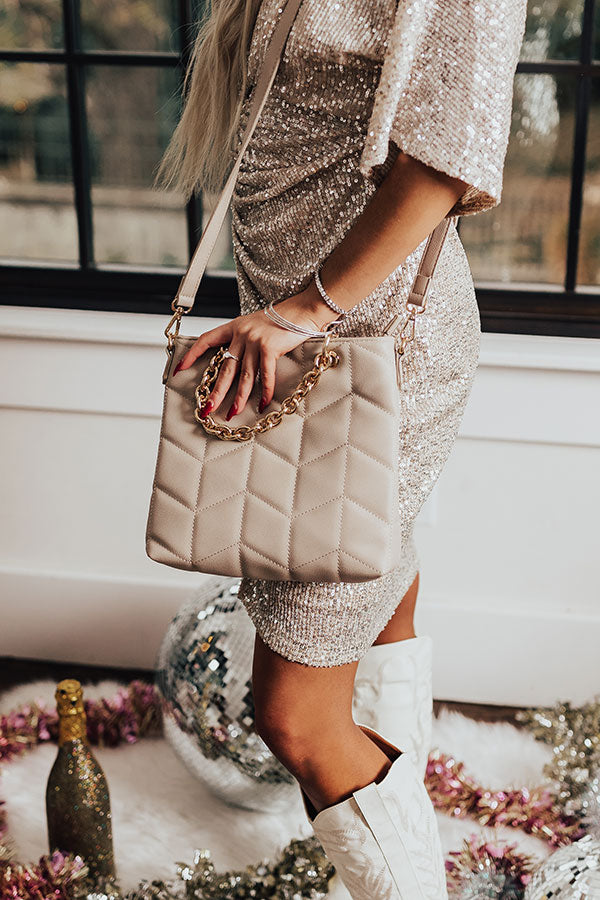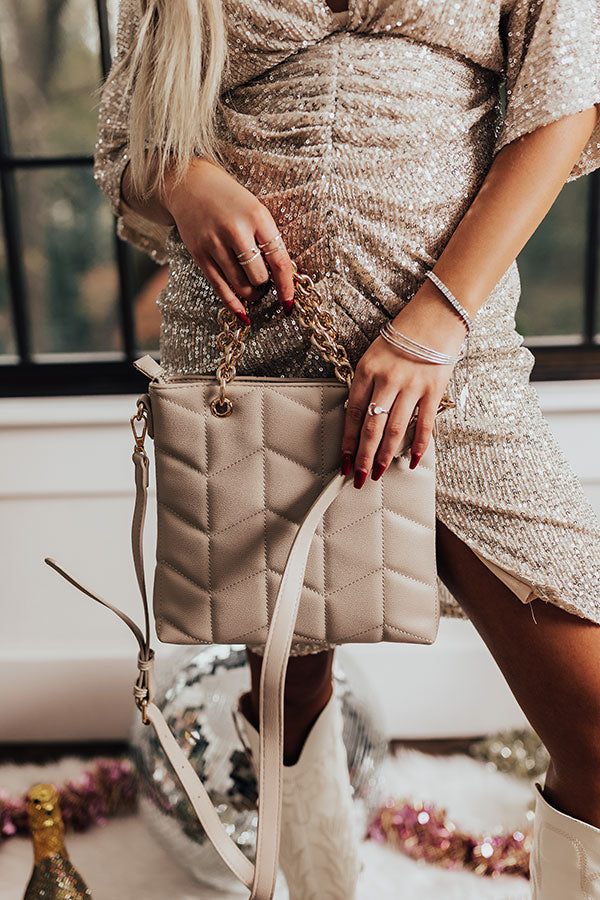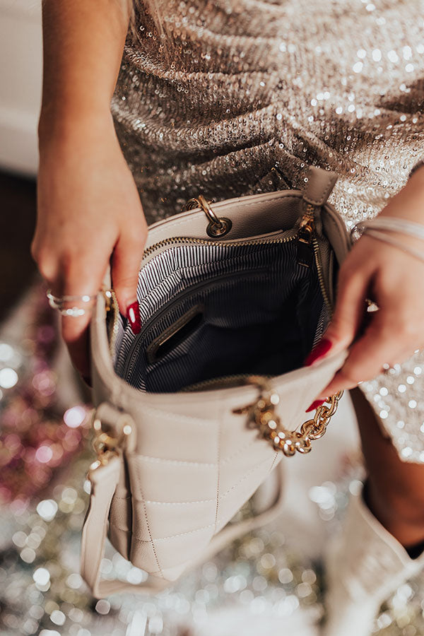 Take your handbag collection to the next level with our luxe birch colored 'Love And Luck' crossbody featuring sleek faux leather material with diagonal quilted texturing, two gold chain link handles, a removable and adjustable shoulder strap, and a spacious fully lined interior with an additional inside zip closure!