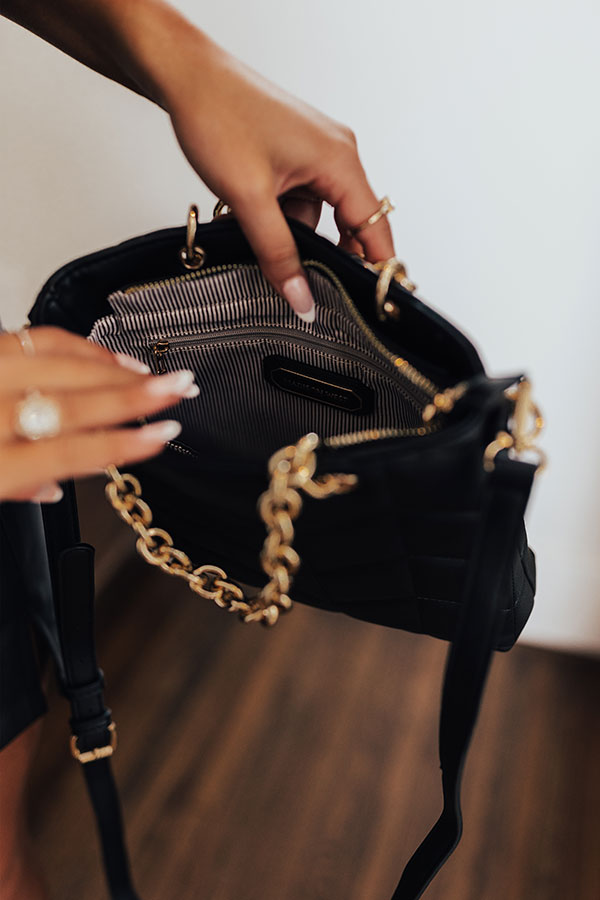 Take your handbag collection to the next level with our luxe black 'Love And Luck' crossbody featuring sleek faux leather material with diagonal quilted texturing, two gold chain link handles, a removable and adjustable shoulder strap, and a spacious fully lined interior with an additional inside zip closure!