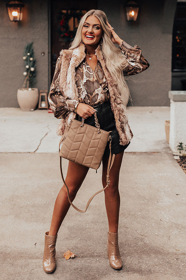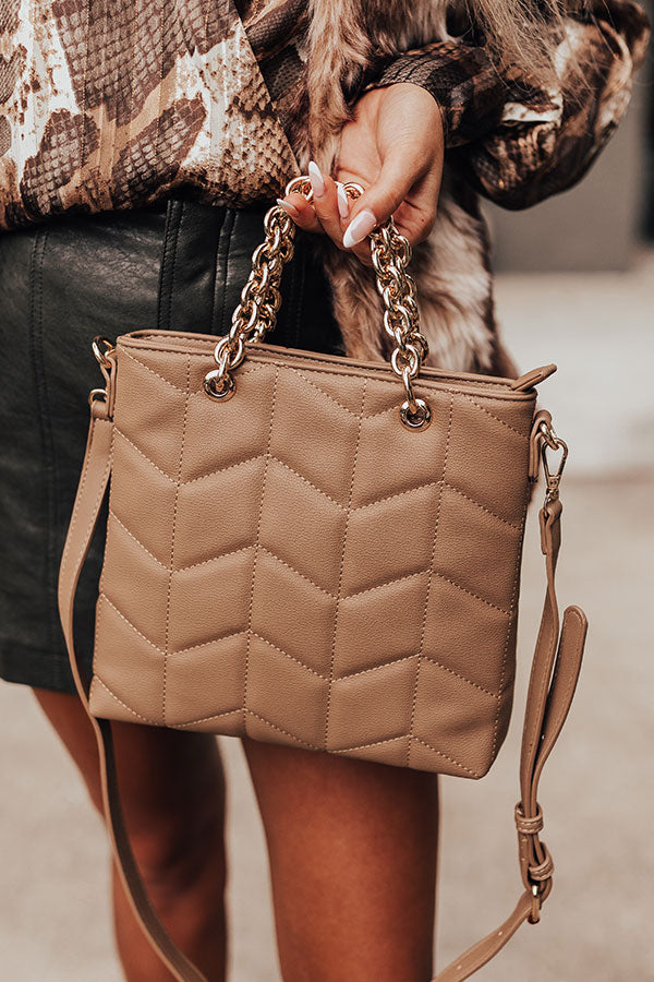 Take your handbag collection to the next level with our luxe mocha colored 'Love And Luck' crossbody featuring sleek faux leather material with diagonal quilted texturing, two gold chain link handles, a removable and adjustable shoulder strap, and a spacious fully lined interior with an additional inside zip closure!