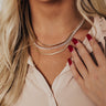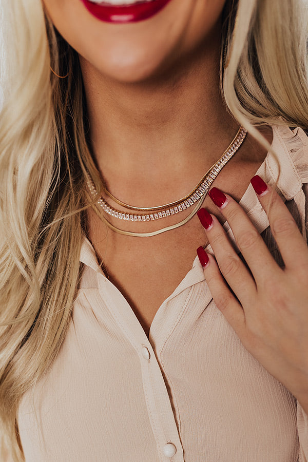 Shimmer and shine with our gold 'Love And Luck' necklace featuring three layered pieces: a short and long snake chain with a large rhinestone chain in the middle!