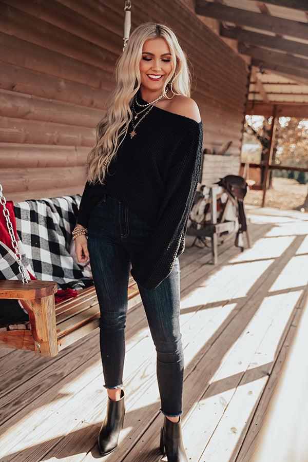 Welcome winter in style with our charming black 'Love At First Frost' sweater featuring soft lightweight but warm material with large waffle knit texturing, a wide rounded neckline that can be worn off one shoulder, long loose sleeves, and a slouched silhouette that falls into a straight tunic-length hemline! Measurements