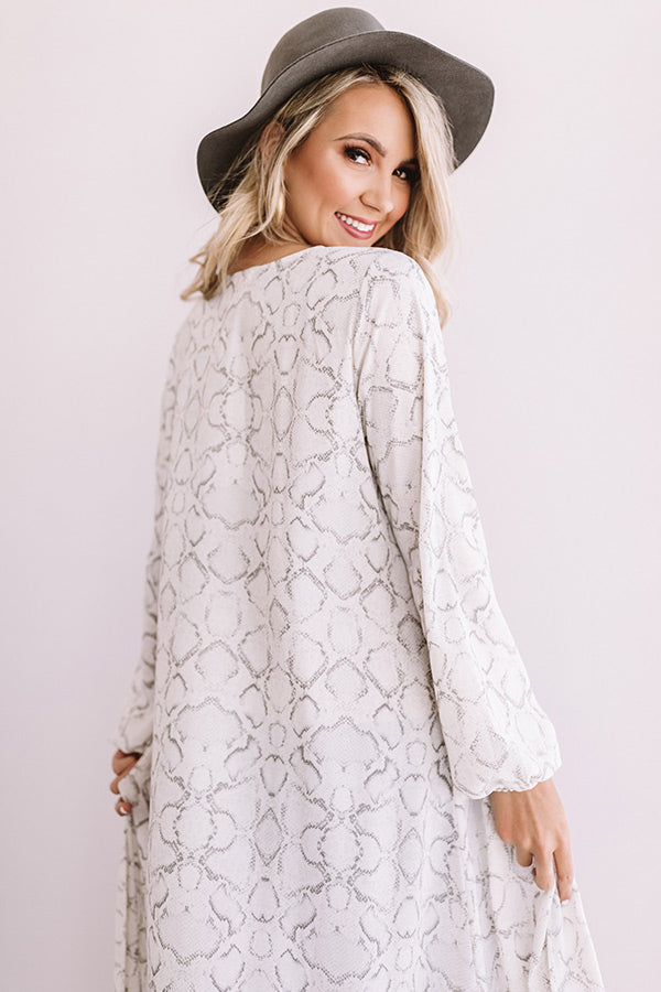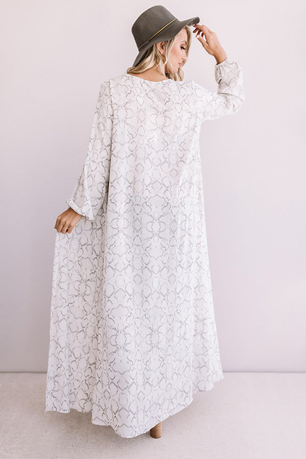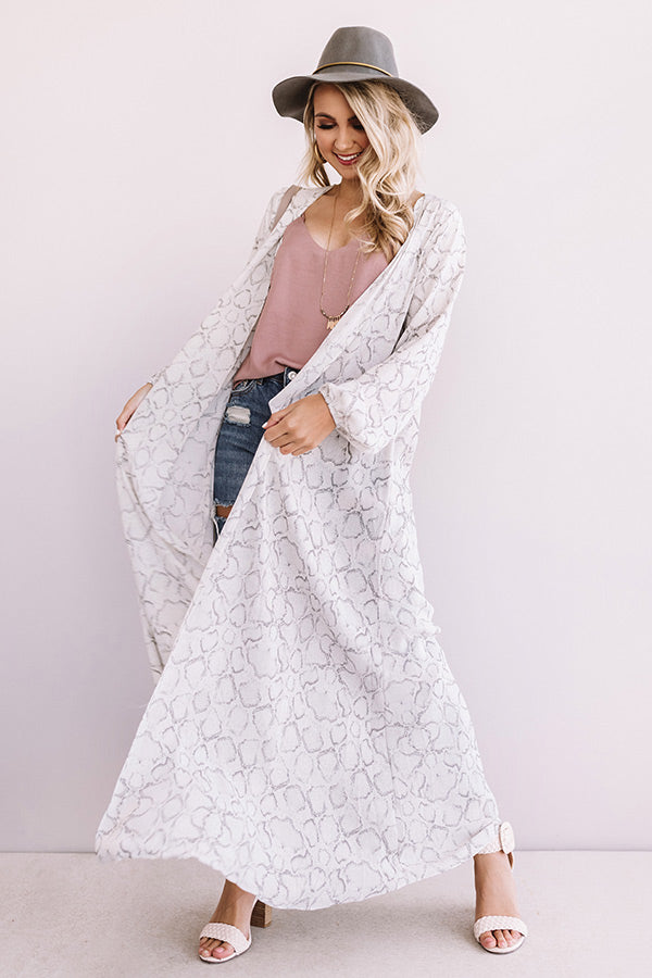 You won't find a more trendy and versatile piece than the grey 'Love In Napa' duster featuring a subtle snake print pattern, long loose sleeves with elastic cuffs, ultra lightweight material, and an open front silhouette that falls into a floor length straight hemline! You can style this chic functional piece with just about anything from a basic tank to a swimsuit, jeans to shorts, wedges to sandals, clutches to totes, and hats to earrings!