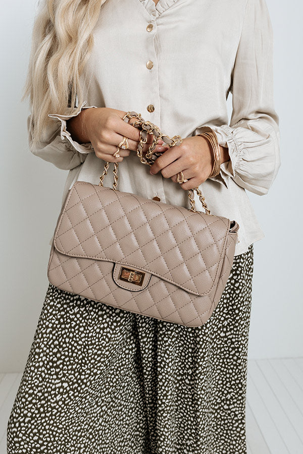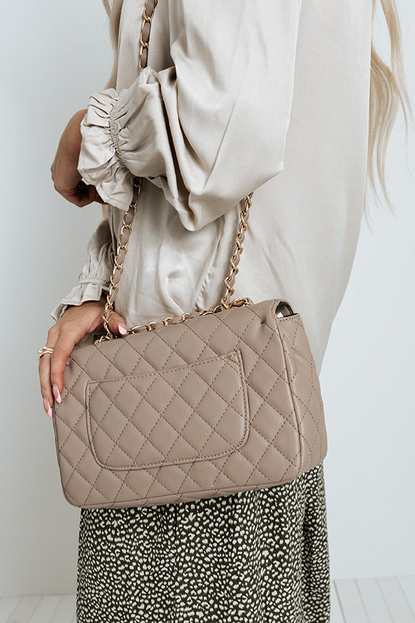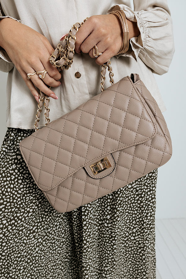 You won't find a more chic handbag than our taupe hued 'Love In The Air' crossbody featuring sleek faux leather material with quilted texturing, an adjustable chain link shoulder strap, a flap closure with gold twist hardware, an outer pouch on the back, and a spacious fully lined rectangular silhouette with a zip closure and an additional inside pocket!