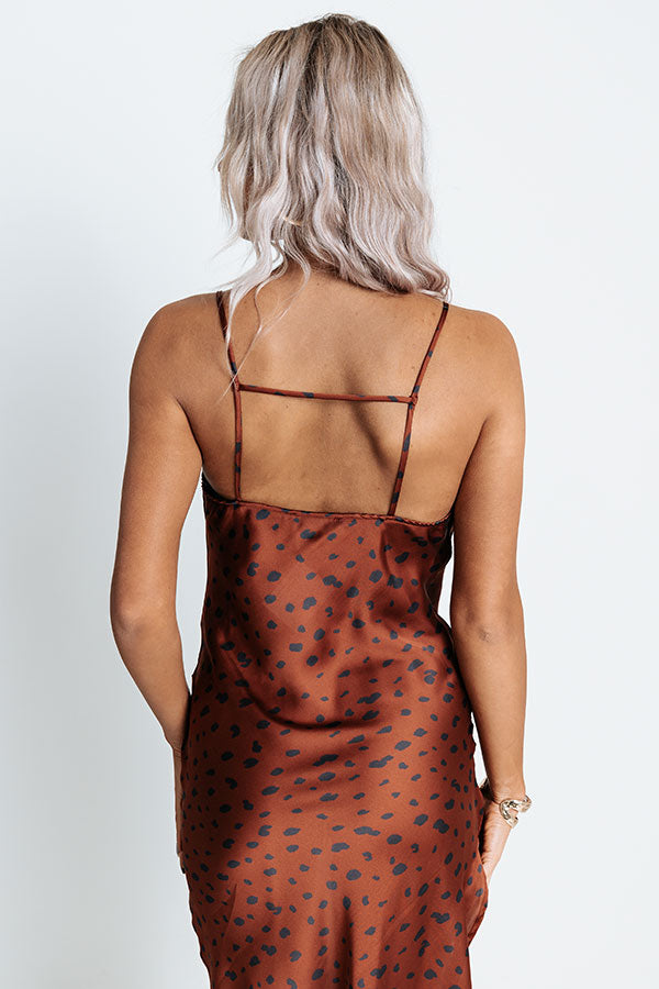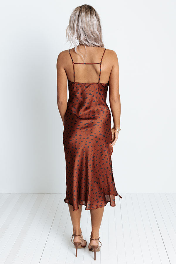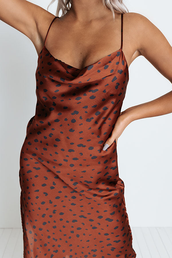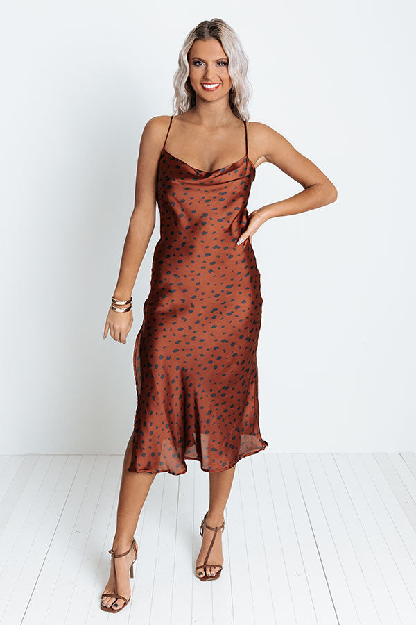 We guarantee you will absolutely love this eye-catching rust colored midi dress featuring sleek lightweight satin material patterned with a navy spotted print, a draped neckline with spaghetti straps, and a relaxed but flattering figure hugging silhouette that falls into an uneven mid-calf length hemline!
