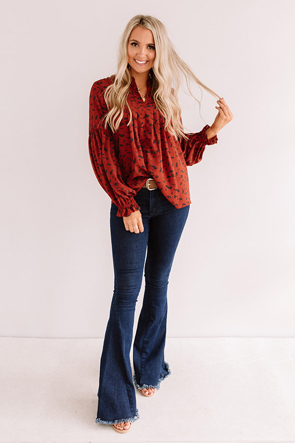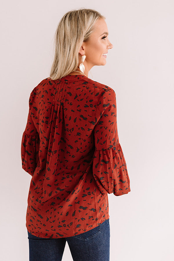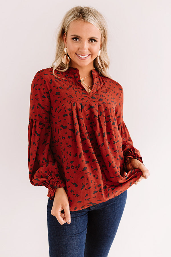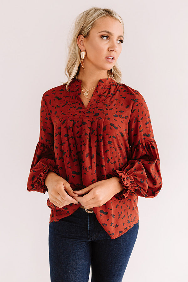You are sure to steal the show in our charming dark rust colored "Love In Tribeca Shift Top" featuring lightweight breezy material patterned with an abstract black spotted print, a high rounded neckline with a v-notch accent, long oversized bishop sleeves with elastic cuffs, and a relaxed silhouette that falls into a rounded hemline! Measurements