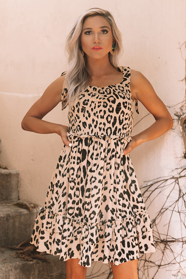 Take a walk on the wild side in our stunning "Love Island" dress featuring lightweight material patterned with a bold black leopard print, a scooped neckline, tied 1-inch shoulder straps with a low open back, a form fitting bodice with smocked detailing, ruffled exposed accent seams, and a relaxed silhouette that falls into an uneven mid-thigh length hemline! We have styled this fierce piece with some black platform heels, but you can also wear it with our "Pass The Prosecco Wool Hat in Black" and our "Champagne And Chic Faux Leather Crossbody in Black!"