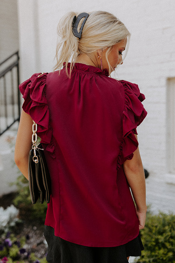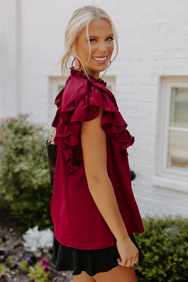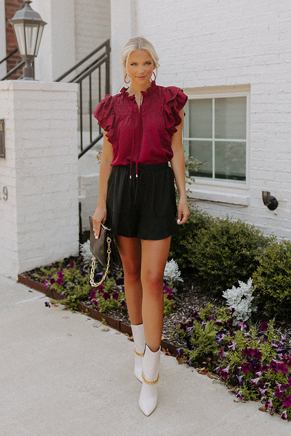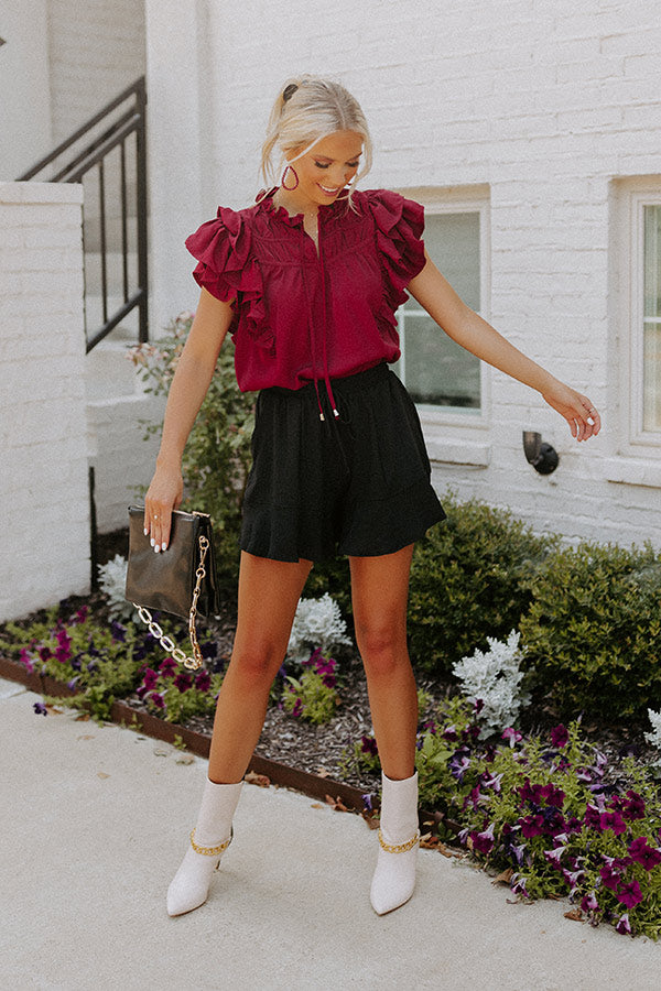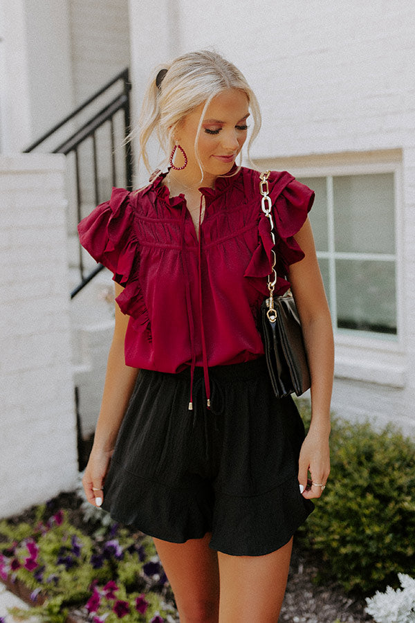 Slay all day in our pretty wine colored 'Love Link Shift Top' featuring lightweight material, accent bunched detailing across the chest with a subtly ruffled tie closure neckline, oversized ruffle cap sleeves, and a relaxed silhouette that falls into a straight hemline!
