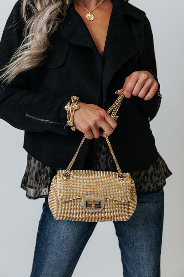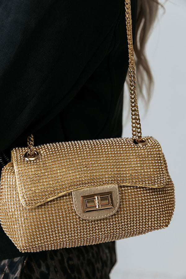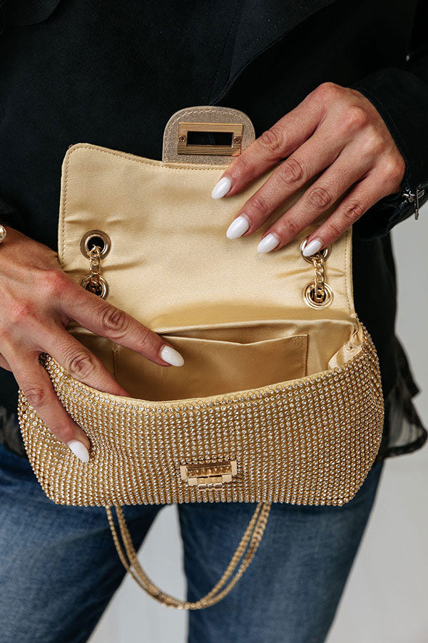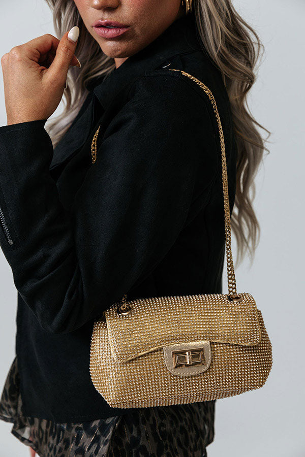 Accessorize like your already famous with our luxe 'Love Me Well' purse featuring shimmering gold rhinestones, a flap closure with twist hardware, an adjustable chain link shoulder strap, and a spacious fully lined oval silhouette with an additional inside pouch!