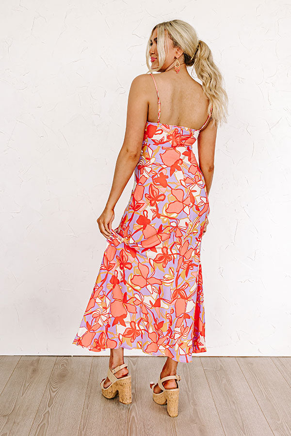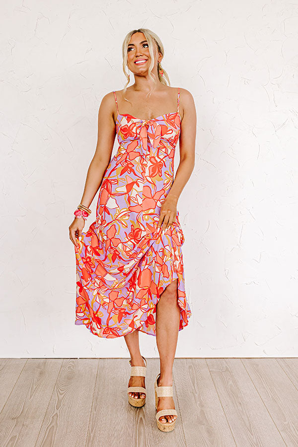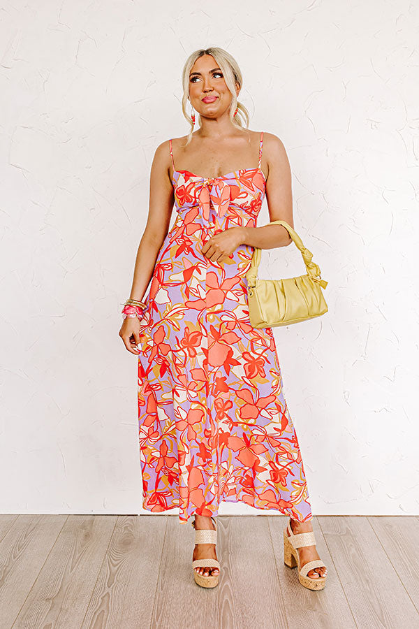 Welcome summer in style with our beautiful 'Love Nest' maxi dress featuring lightweight material patterned with a red, coral, lavender, and golden honey hued floral print, a scooped v-cut neckline with a front tie detail, adjustable spaghetti straps, and a flattering silhouette that falls into a straight ankle-length hemline! on products