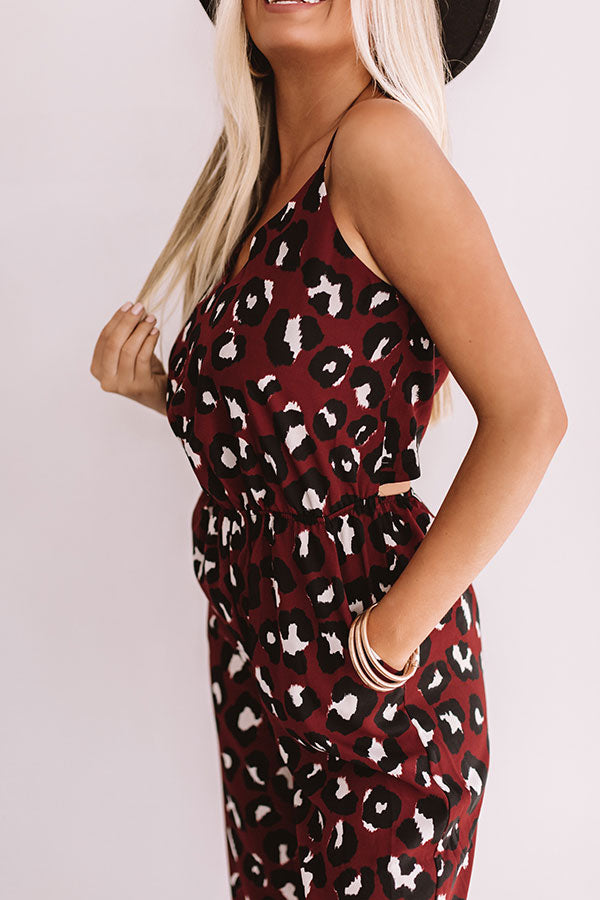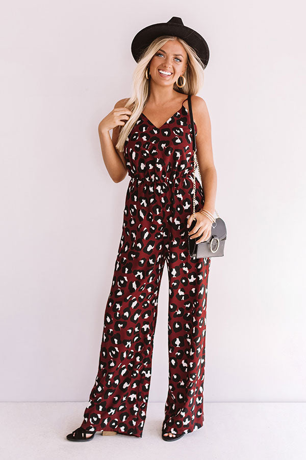 Suit up and take a walk on the wild side in the "Love Notes Leopard Jumpsuit in Wine" featuring a v-neck, cinched waist, flowy pants, and spaghetti straps, that provide a flattering fit and a criss crossed open back that adds just a bit of sass! It's safe to say we're obsessed with this piece especially when it's styled with gold hoop earrings and all black accessories like strappy block heels, a faux suede hat, and a chic crossbody!