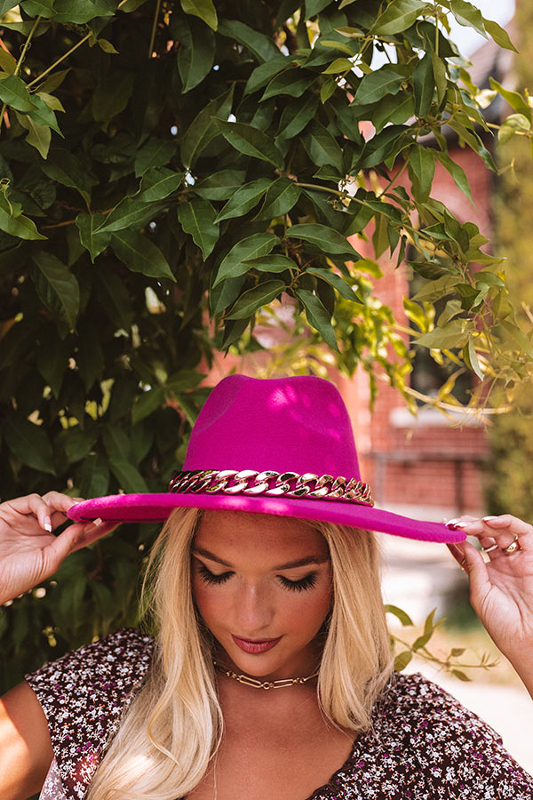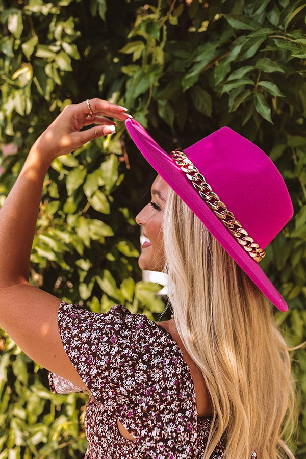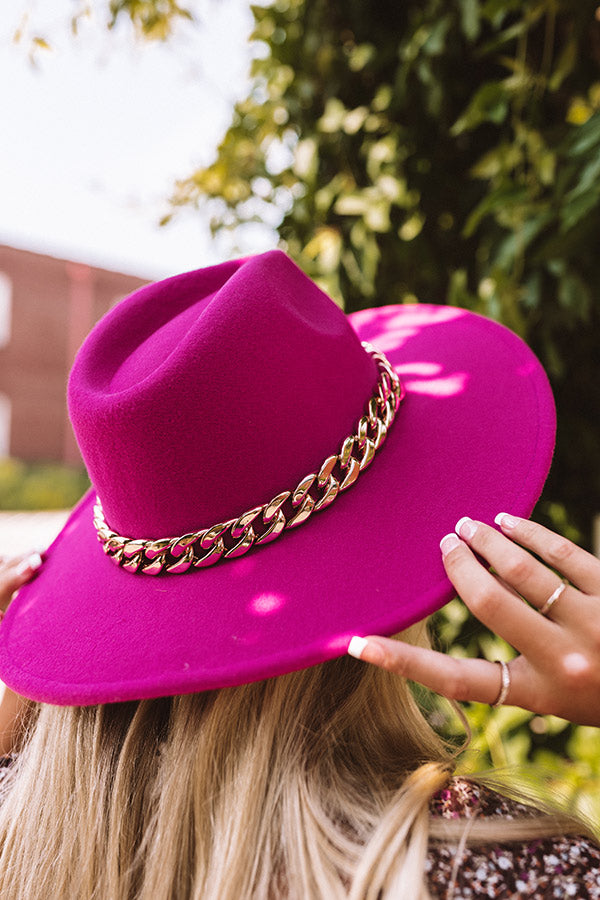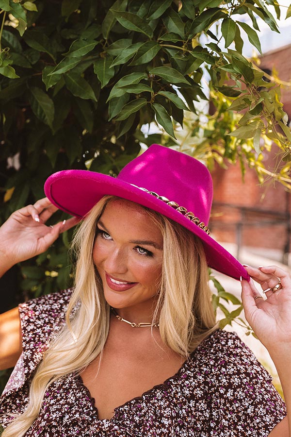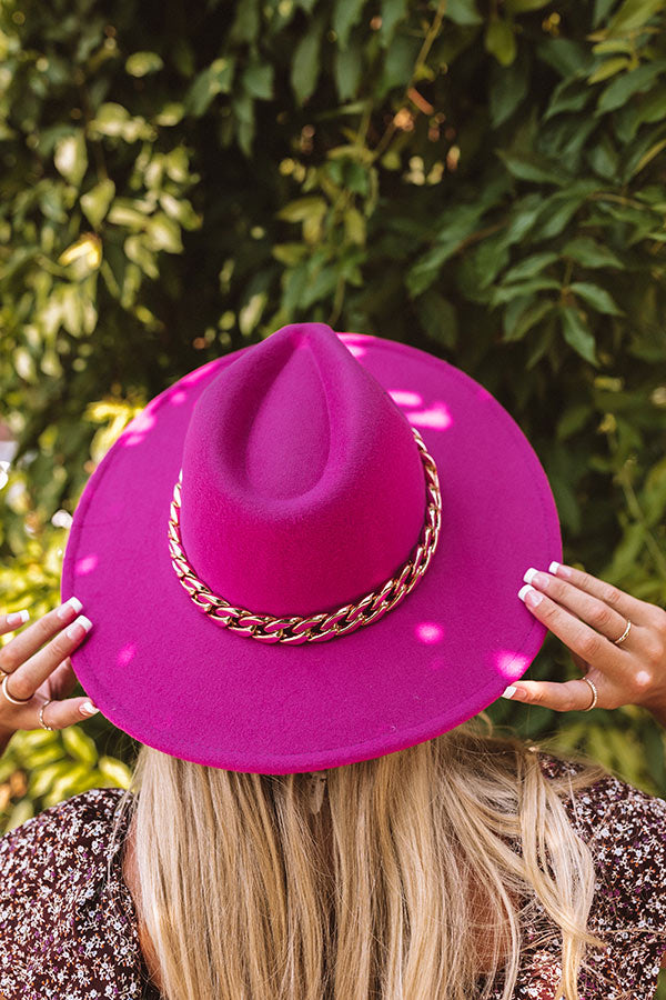 Top off your fall wardrobe in the best and most stylish way with our chic fuchsia colored 'Love Of Lattes hat featuring soft lightweight felt material, a wide 4-inch brim, and a large gold chain link accent band!