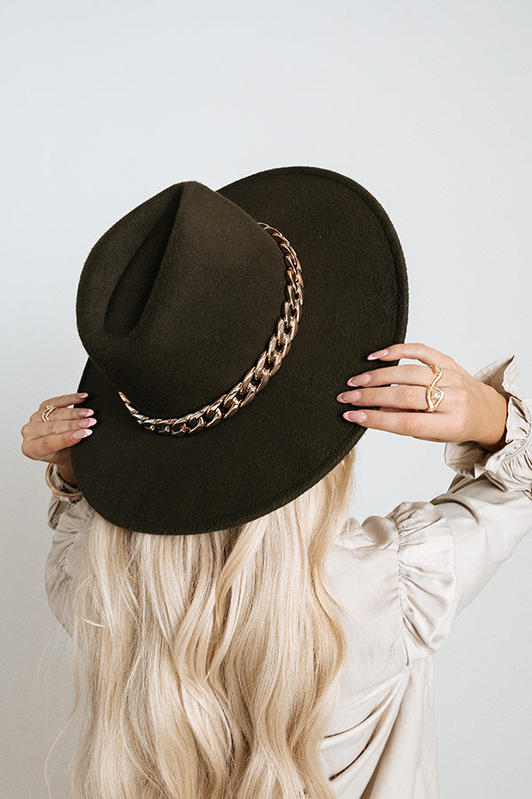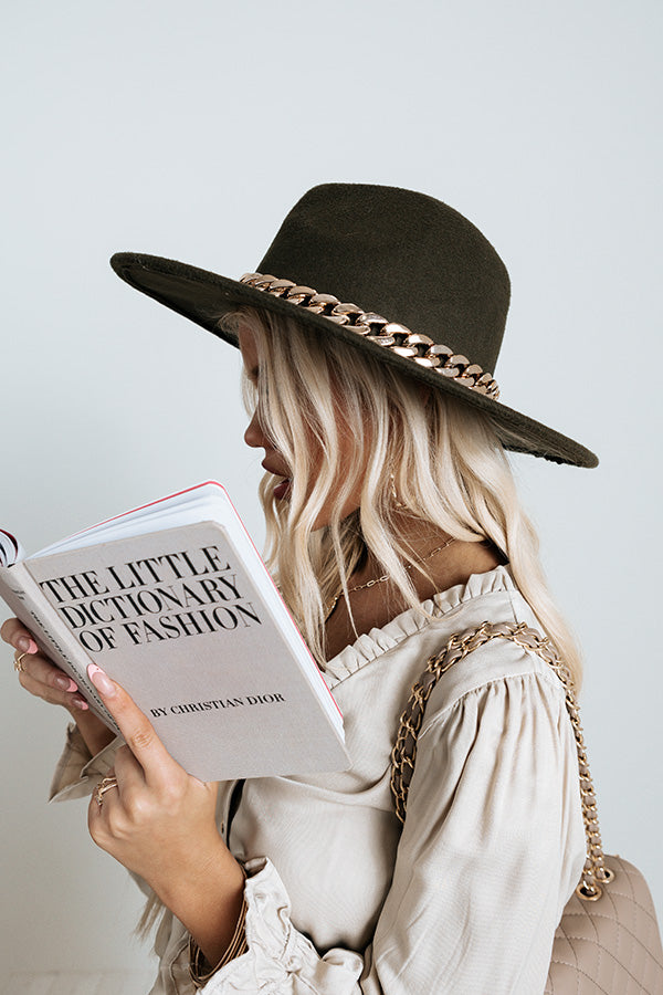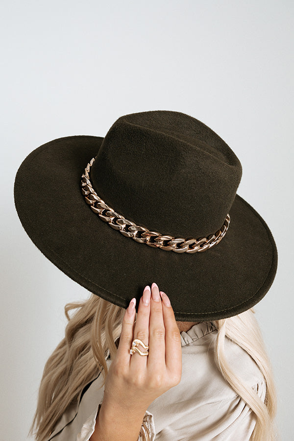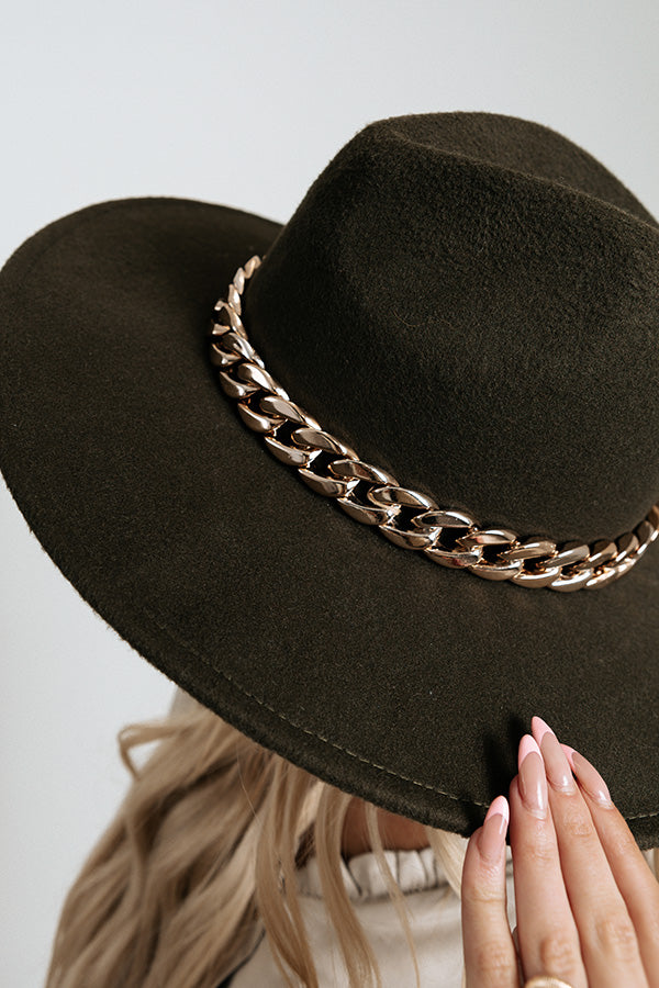Top off your fall wardrobe in the best and most stylish way with our chic olive colored 'Love Of Lattes' hat featuring soft lightweight felt material, a wide 4-inch brim, and a large gold chain link accent band!