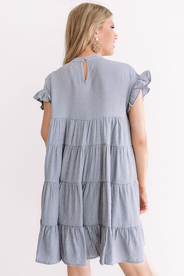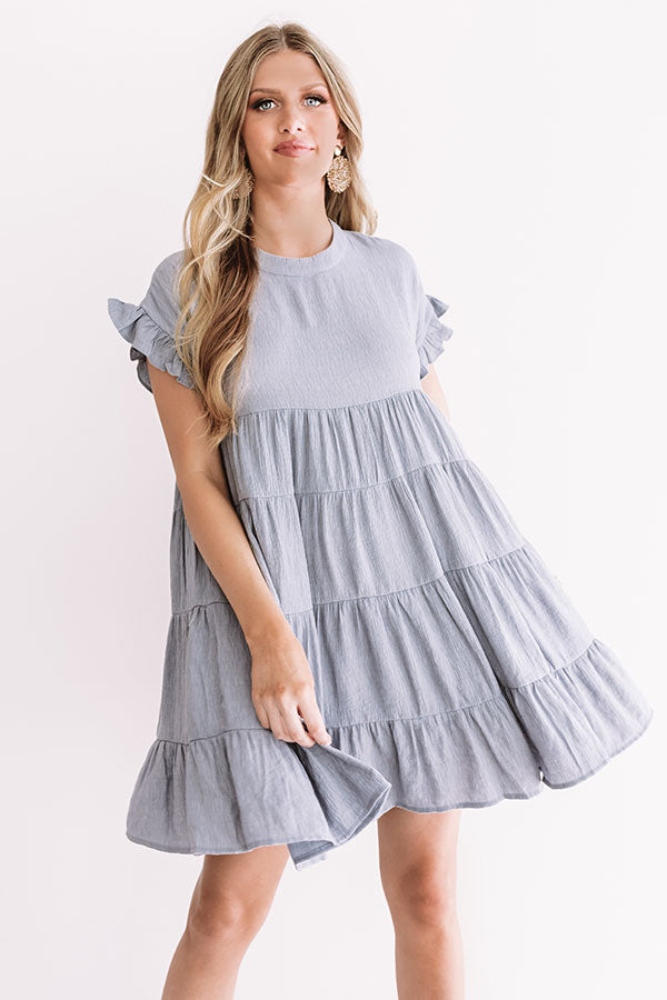 Put a little "love potion" in your motion to create an irresistible look with all the right skills! This light slate dress features short sleeves with ruffled trim, a high rounded neckline, a keyhole accented upper back, and an empire cut upper bodice that falls into a tiered babydoll silhouette with a mid-thigh length uneven hemline! Style this dress with a neutral cutout wedge and crossbody, or with "The Elena Snake Print Heel" and our "Twist And Shout Snake Print Headband" for a trendy transitional look with a boho personality!