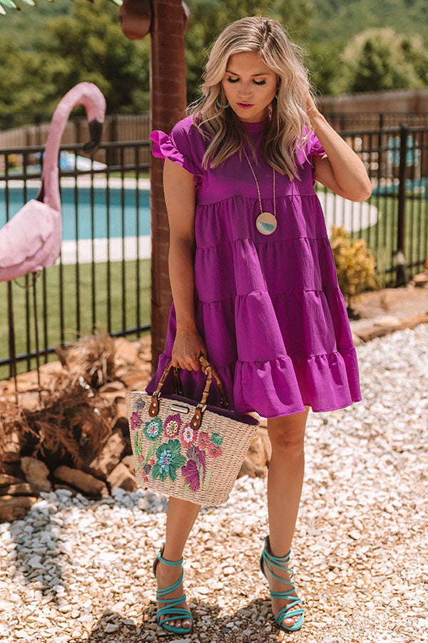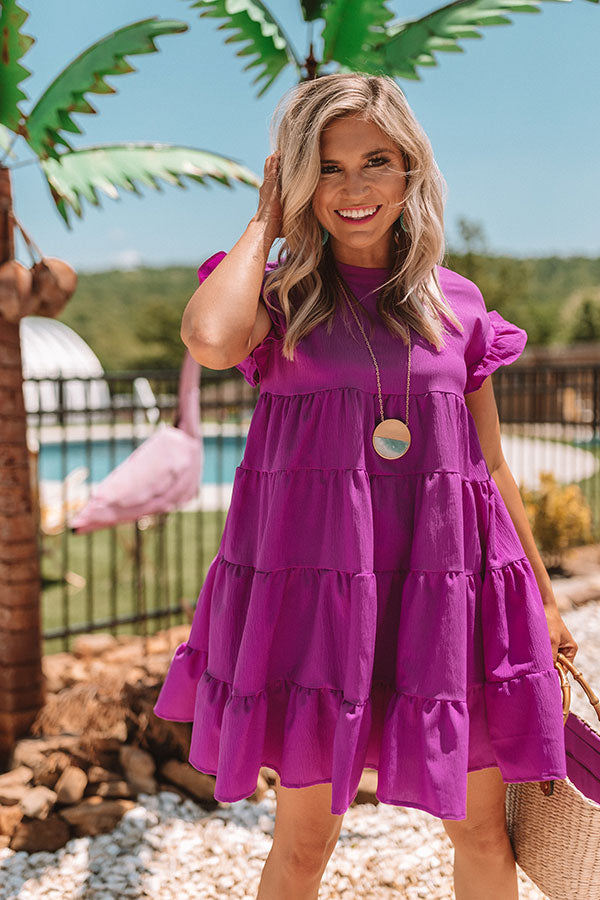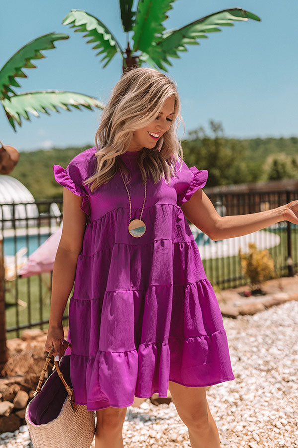 Put a little "love potion" in your motion to create an irresistible look with all the right skills! This orchid dress features short sleeves with ruffled trim, a high rounded neckline, a keyhole accented upper back, and an empire cut upper bodice that falls into a tiered babydoll silhouette with a mid-thigh length uneven hemline! Style this dress with turquoise heels, a statement necklace, and a straw tote, or with "The Elena Snake Print Heel" and our "Twist And Shout Snake Print Headband" for a trendy transitional look with a boho personality!