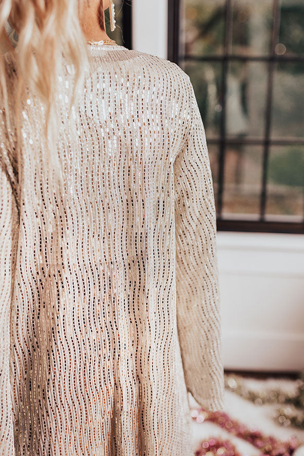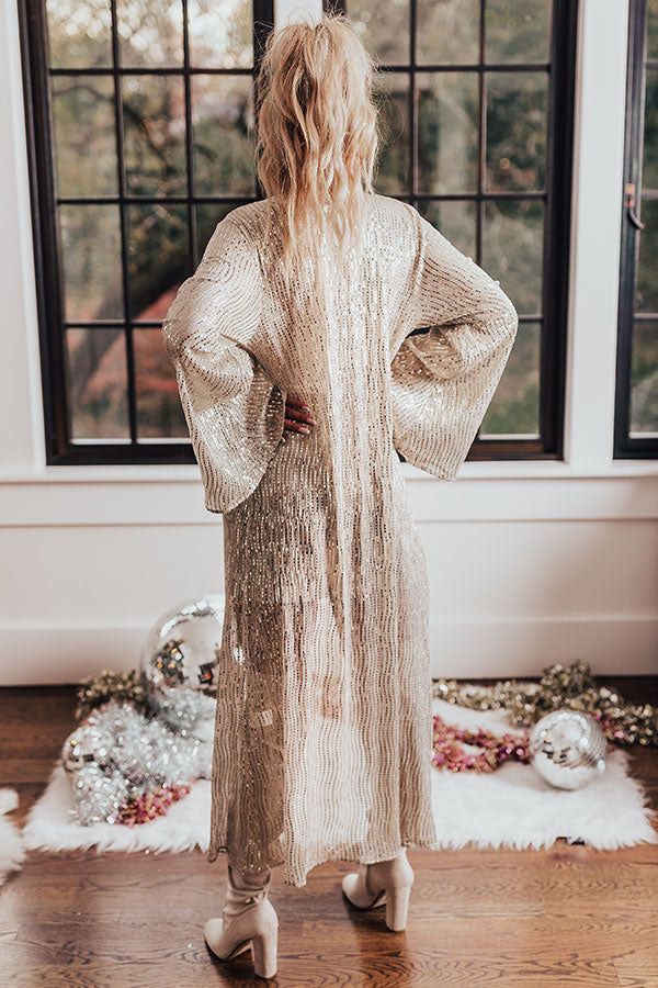 Layer up in sparkles with our pretty 'Love Songs On Repeat' duster featuring shimmering champagne colored sequins throughout, long loose sleeves with bell cuffs, and a draped open front silhouette that cascades into a straight ankle-length hemline! Measurements