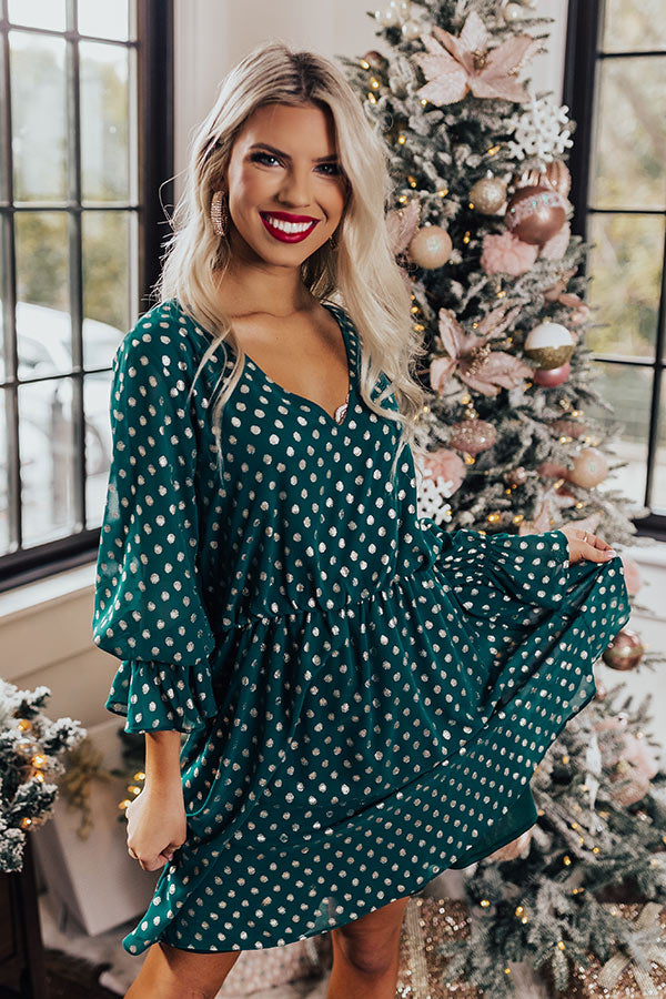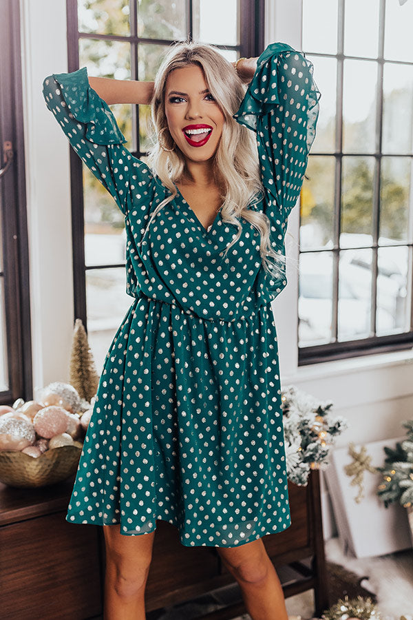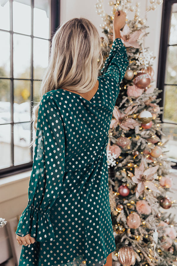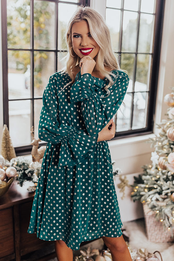 Twirl through the holiday season in our pretty hunter green 'Love This Feeling' dress featuring lightweight flowy material patterned with gold polka dots, a v-cut neckline, long loose sleeves with bell cuffs, a cinched waistline, and a relaxed skirt silhouette that falls into a straight mid-thigh length hemline!