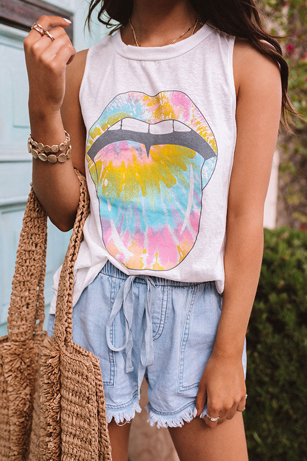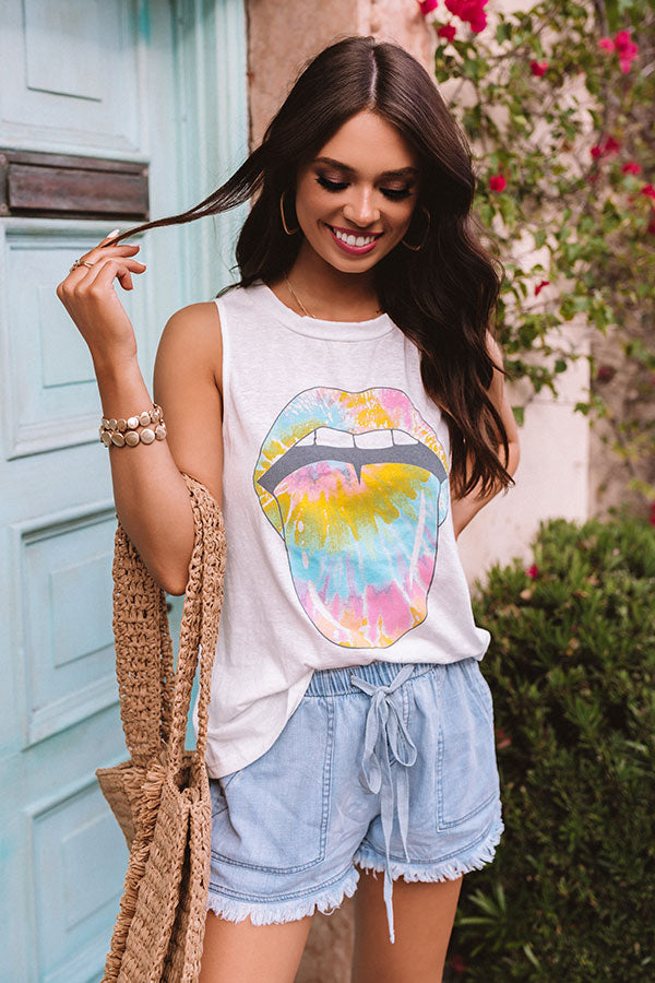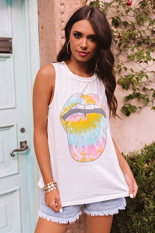 Make a statement in our adorable white 'Love To Laugh' tank featuring soft lightweight material, a scooped neckline, wide 3-inch sleeveless shoulder straps with a wide racerback fit, a pink, blue, and yellow tie dye mouth graphic on the front, and a relaxed silhouette that falls into a straight hemline! Measurements