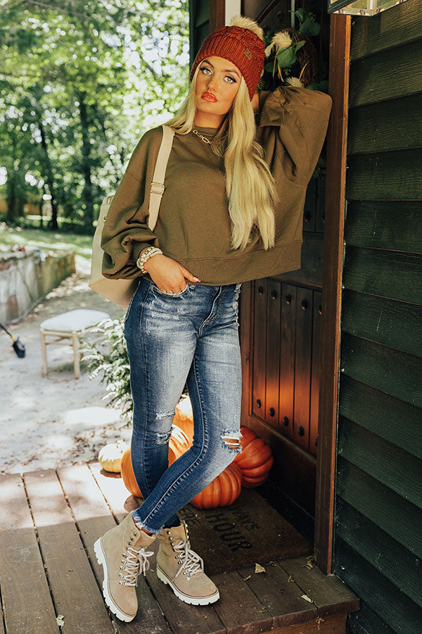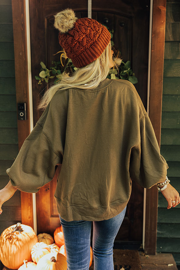 Chill out in style with this basic but lovely olive colored sweatshirt featuring soft lightweight cotton blend material, a rounded neckline, long loose sleeves, and a slouched silhouette that ends in a straight hemline! Measurements