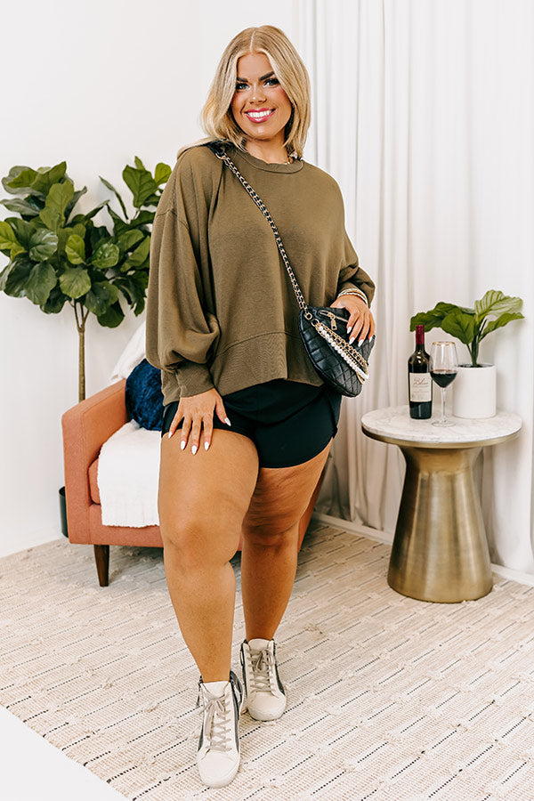 Chill out in style with this basic but lovely plus size olive colored sweatshirt featuring soft lightweight cotton blend material, a rounded neckline, long loose sleeves, and a slouched silhouette that ends in a straight hemline!