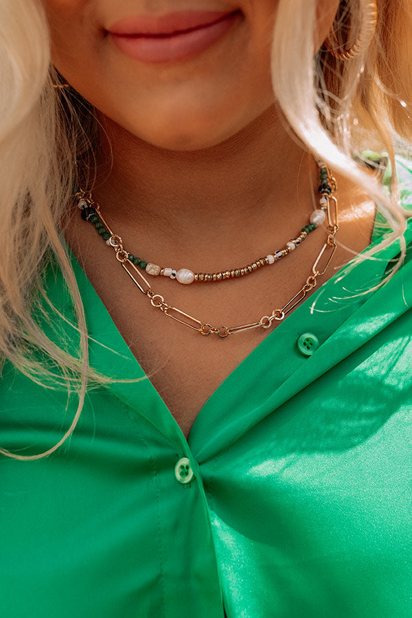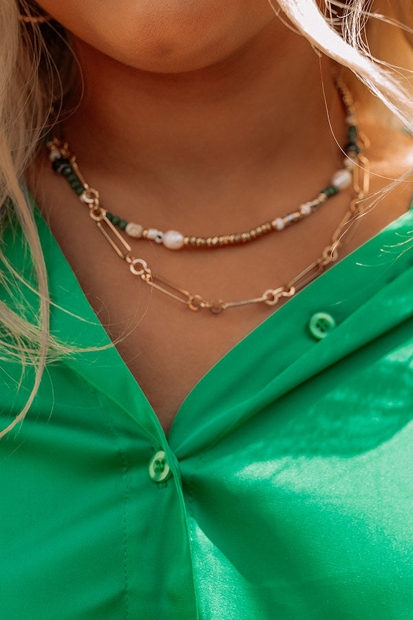 You are guaranteed to have a lovely evening when you accessorize with this charming layered necklace featuring two pieces: shorter a gold stacked, black, and pearl beaded strand and a longer gold paperclip-like chain!