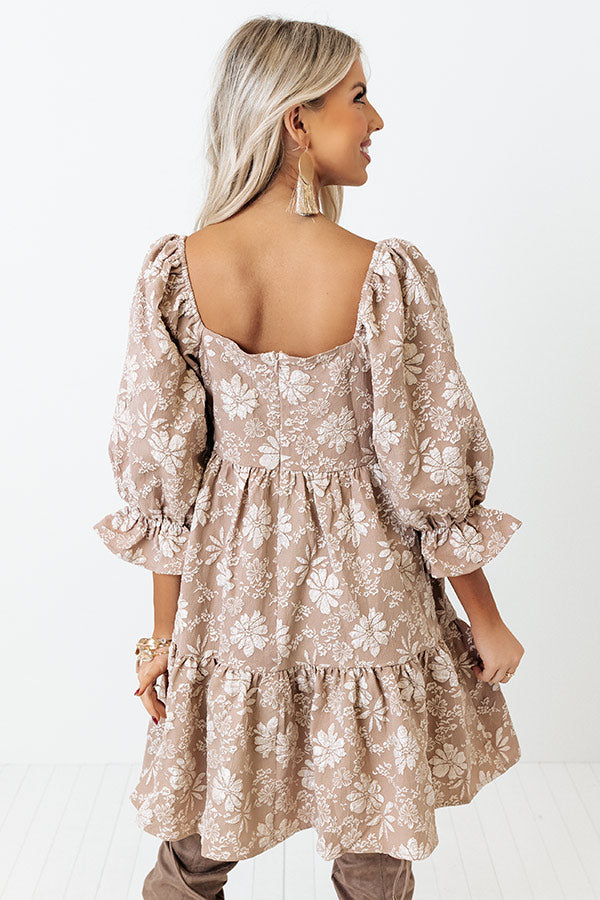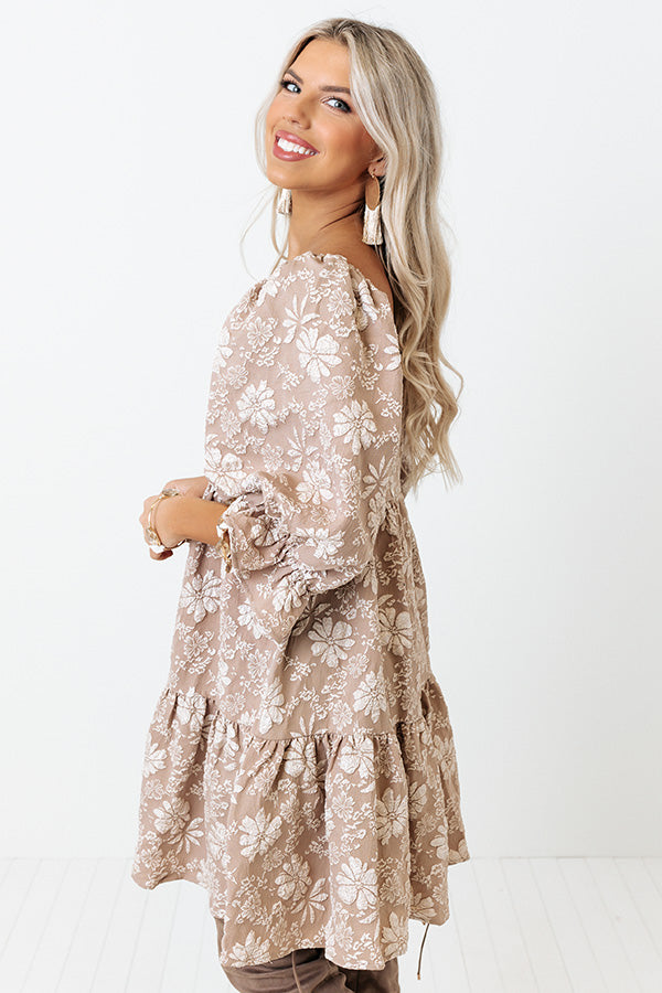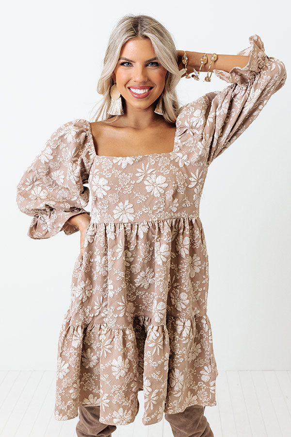 Dance to the beat of your own tune in this charming warm taupe colored dress featuring lightweight material with a textured floral pattern, a flirty square neckline and upper back, 3/4-length bishop sleeves with flared cuffs, and a relaxed tiered silhouette that falls into a straight mid-thigh length hemline! Measurements