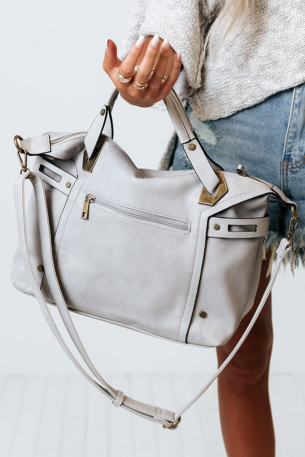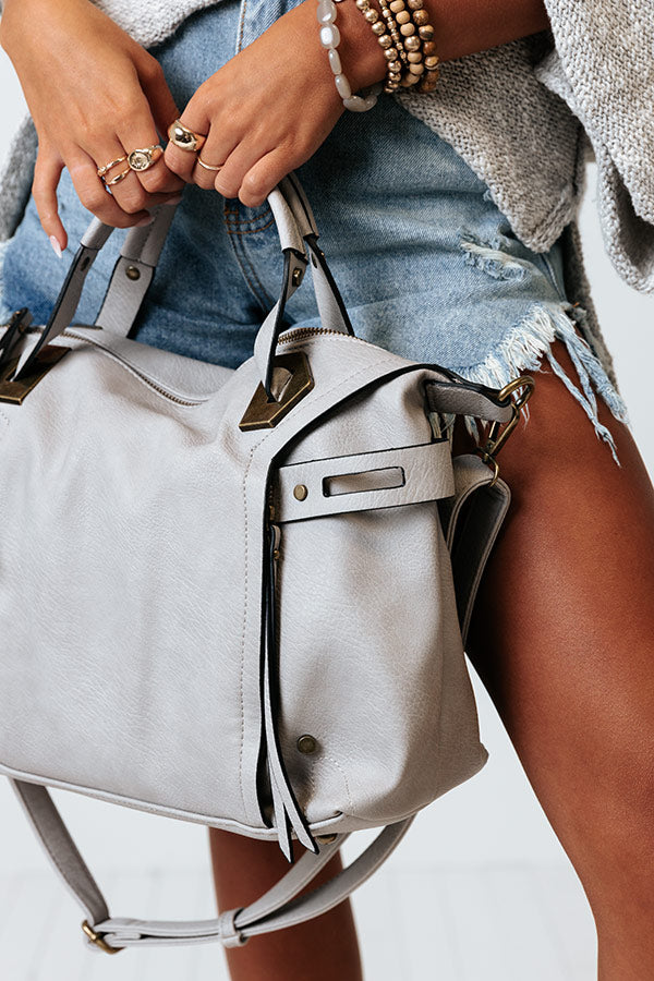 Tote around in style with our stunning light grey 'Lovely Novella Tote' featuring sleek faux leather material, two shorter tote handles, an adjustable and removable crossbody strap, antique god hardware, and a spacious lightweight fully lined pouch with a zip closure and additional inside pockets!