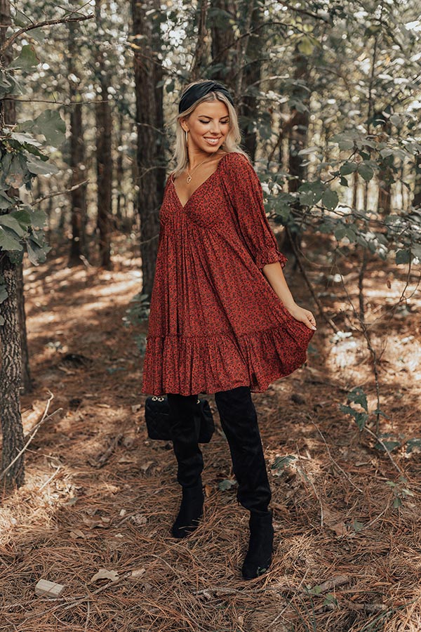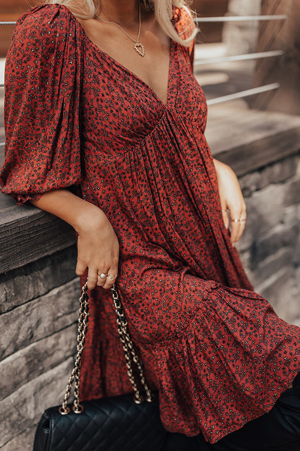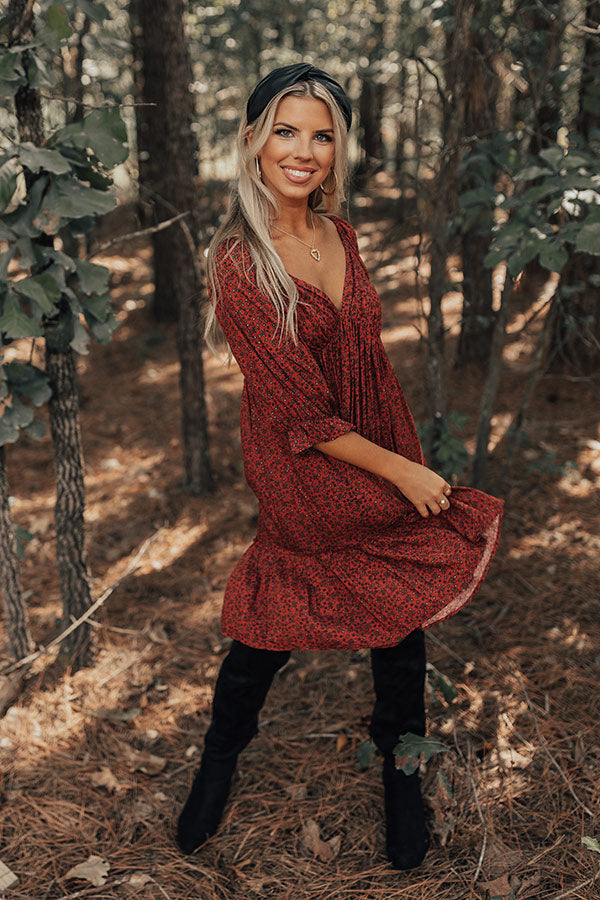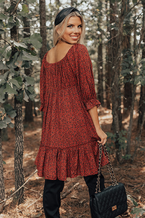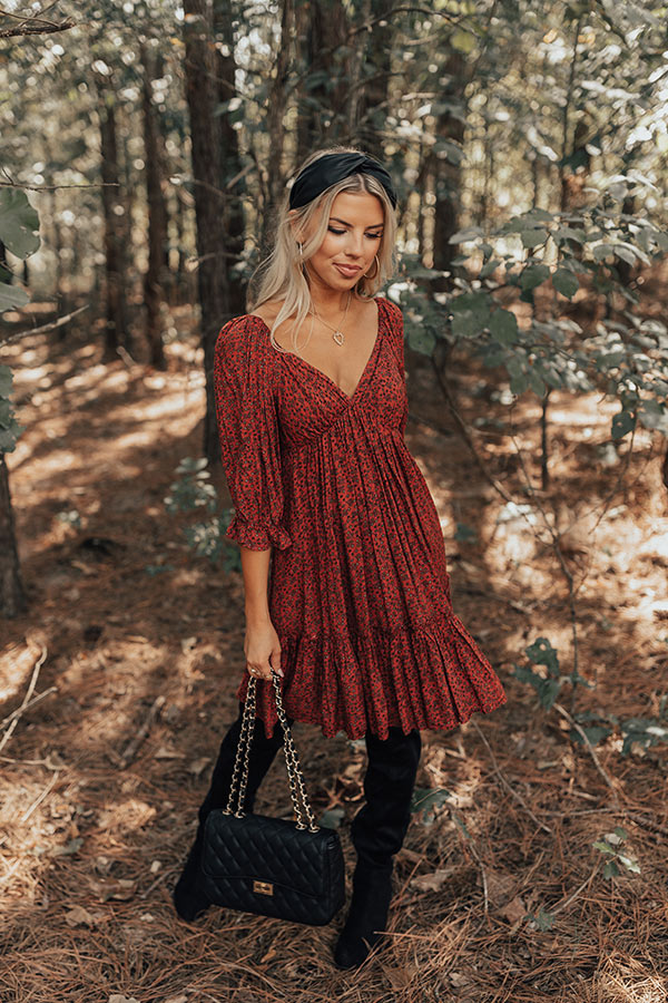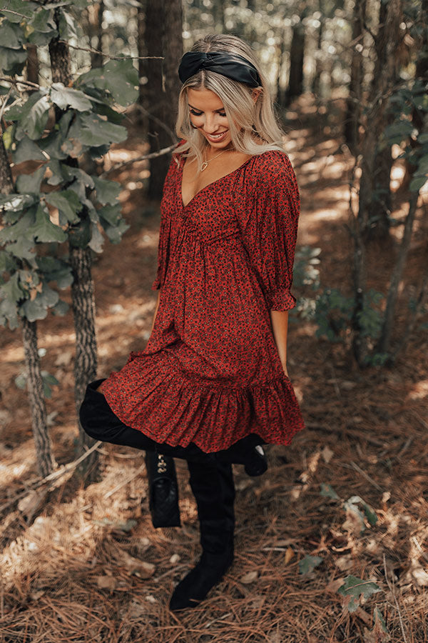 Twirl into fall in our beautiful aurora red colored 'Lovely Rose' dress featuring lightweight flowy material patterned with a black spotted print, a v-cut neckline, 3/4-length bishop sleeves with flared cuffs, and a relaxed babydoll silhouette that falls into an uneven knee-length peplum hemline! Measurements
