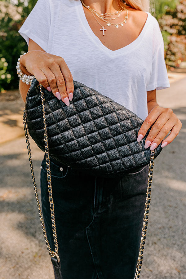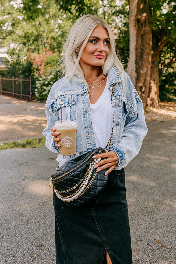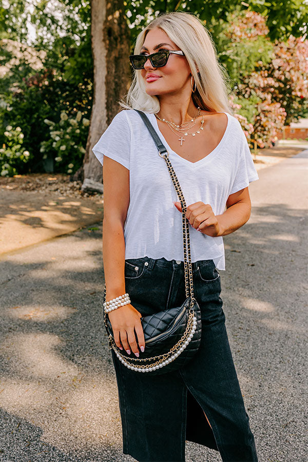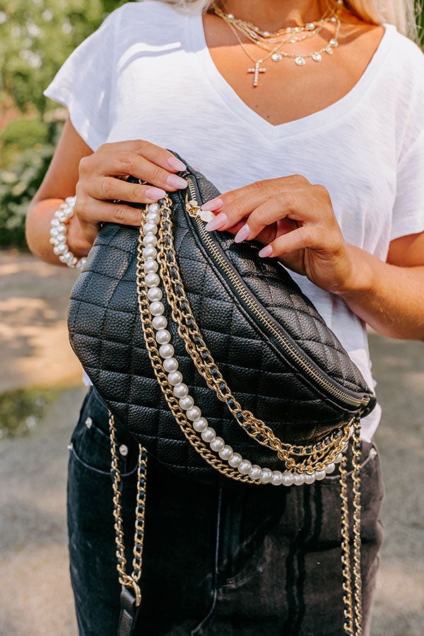 - A multi-strand chain link, faux leather, and faux pearl handle