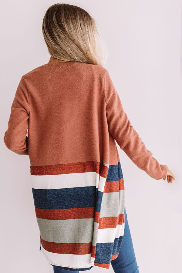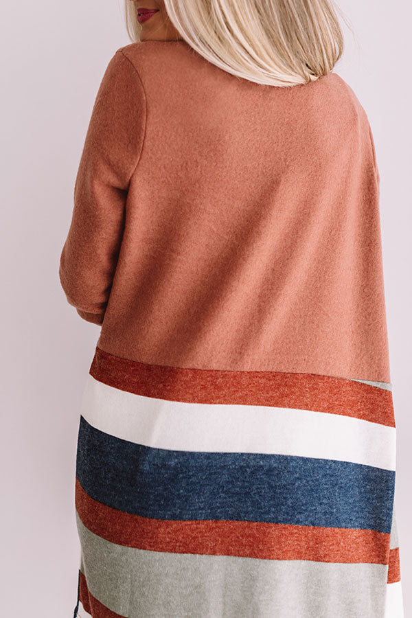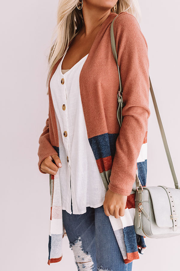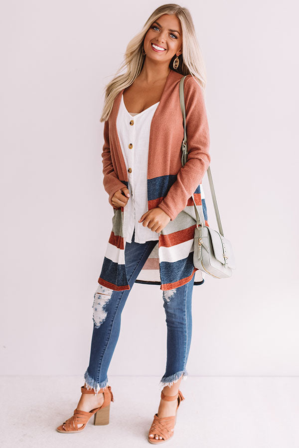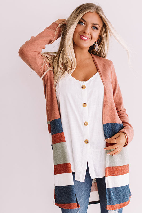 Add a finishing touch and a bit of warmth to any look with the "Loving Manhattan" olive cardigan featuring fall colored stripes, a mid-thigh length hem, long fitted sleeves, soft material , and an open front! This autumn essential is gorgeous styled over a white tank with distressed skinnies, a dark nude strappy heel, and a chic crossbody, but it can also be paired with "The Vivienne Distressed Denim Skirt in Light Wash," a grey faux suede hat, and "The Kendal Bootie in Light Grey" for an ideal chilly weather OOTD! Measurements
