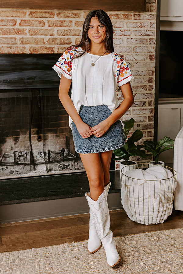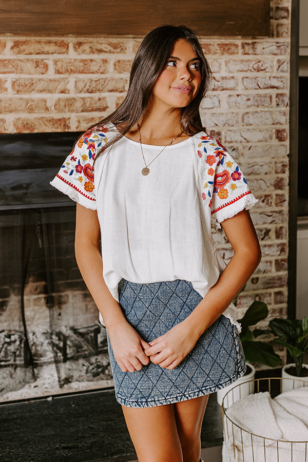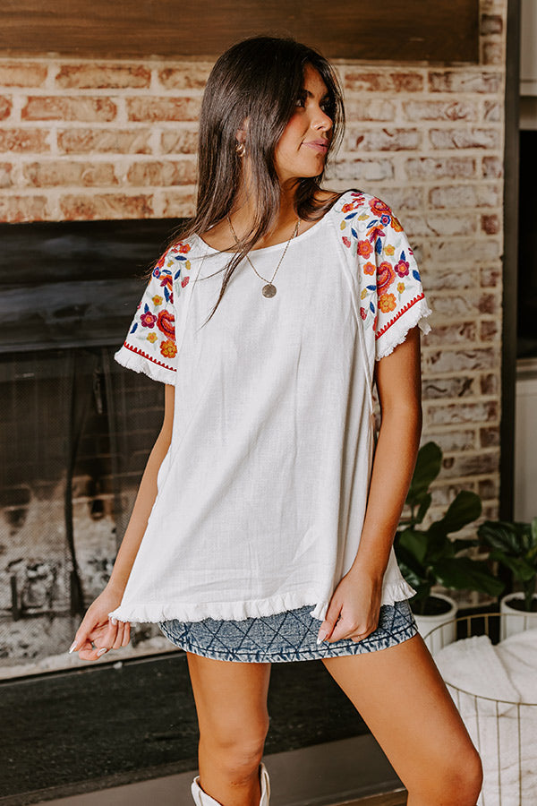 - Short sleeves featuring colorful floral embroidery with unfinished frayed cuffs