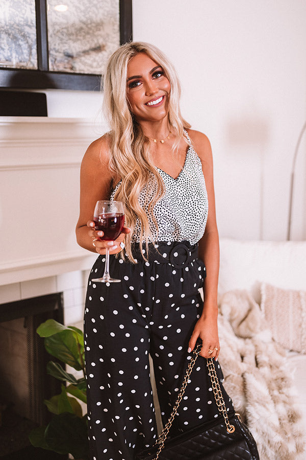 Keep your look lowkey in this adorable white tank featuring lightweight material patterned with small black polka dots, a v-cut neckline, adjustable spaghetti straps with a low open back, and a relaxed silhouette that falls into a straight hemline! This upscale basic styles perfectly with some chic matching trousers and a black strappy heel and quilted faux leather tote, but you can also wear it with some distressed denim shorts, our white "Estelle Booties," and our "Merlot Nights Hat in Black!" Measurements
