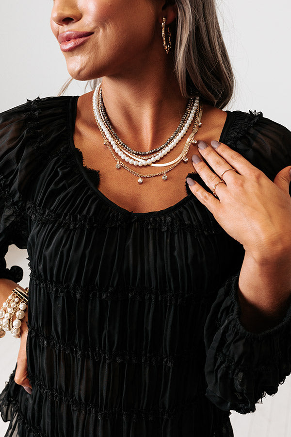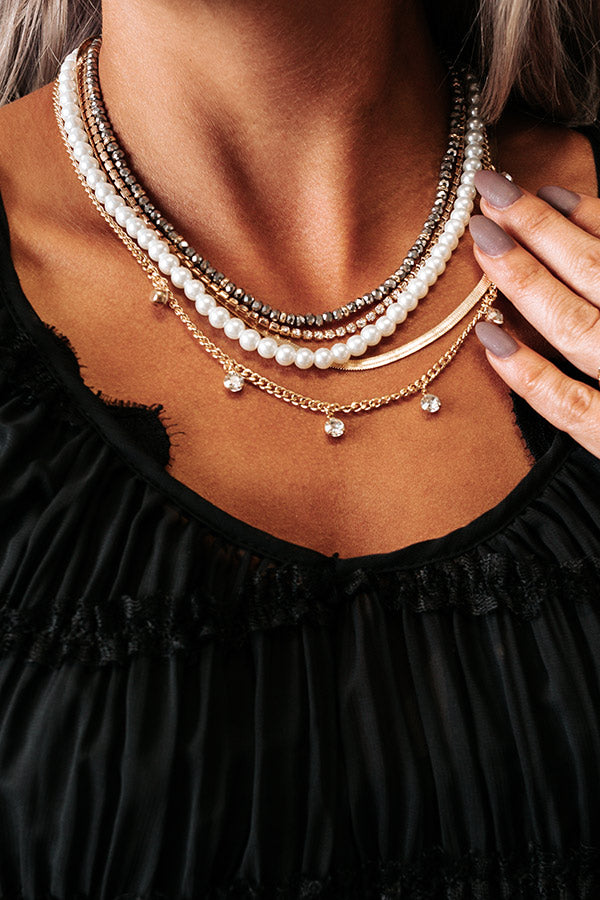 Layer yourself in luxury with our elegant 'Luckiest Of All' necklace featuring five layered pieces: a gold snake chain, a dainty link chain with small rhinestone charms, a pearl chain, and one black and one gold rhinestone chain!