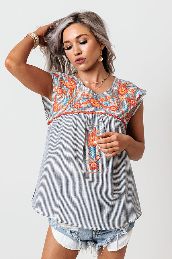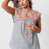 You are sure to receive endless compliments in our darling 'Lucky Lane' shift top featuring lightweight material patterned with vertical accent stripes and intricate orange and blue embroidered floral detailing across the chest and shoulders, a rounded neckline, cap sleeves, a keyhole accented upper back with a button closure, and a relaxed silhouette that falls into a straight hemline! Measurements