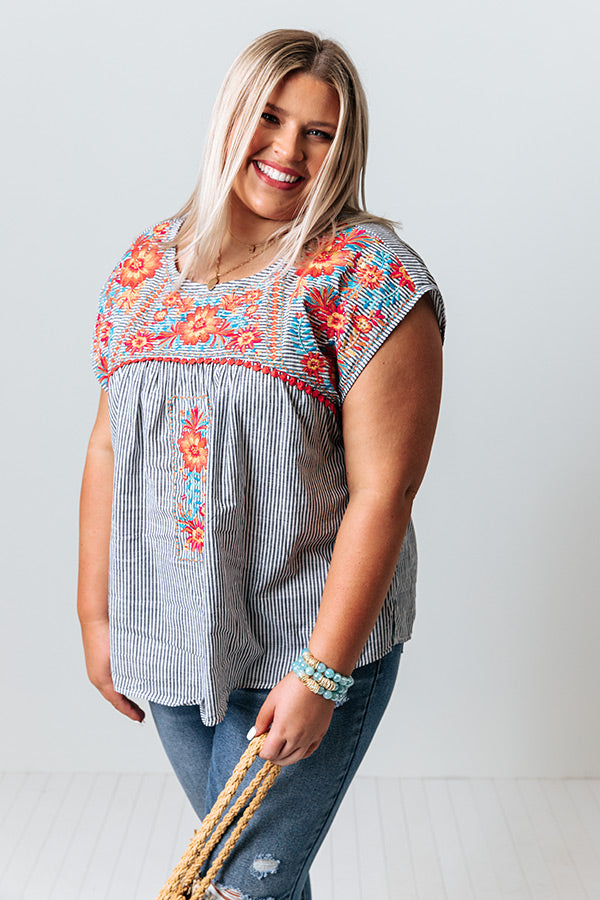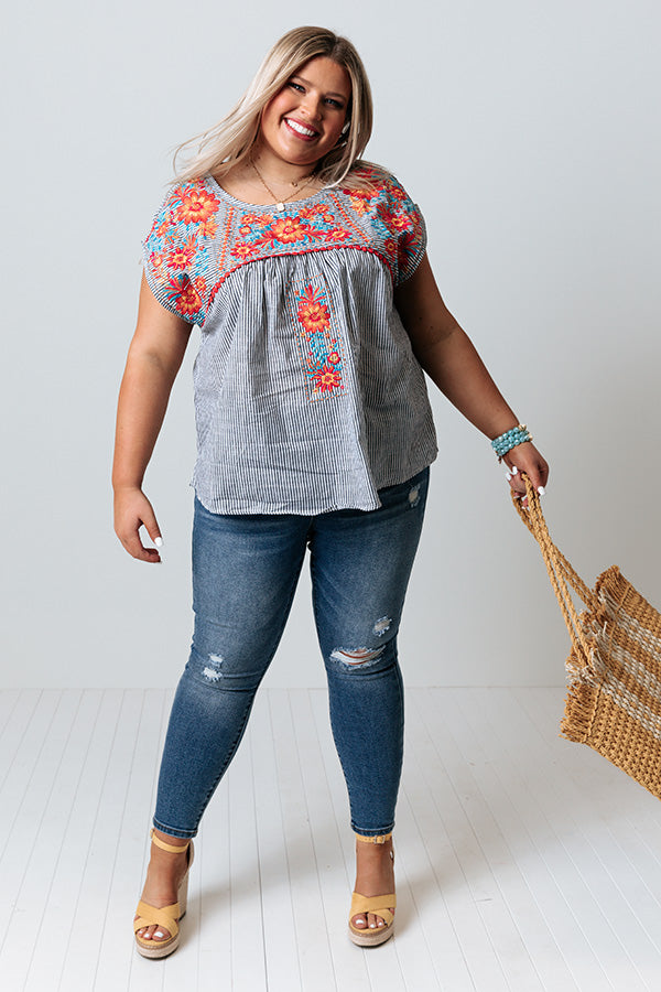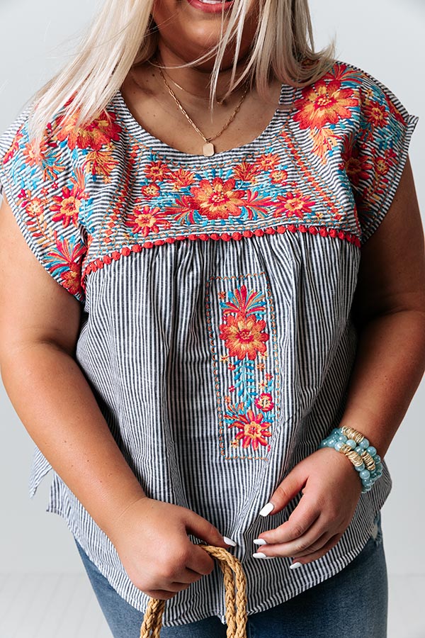 Plus Size - You are sure to receive endless compliments in our darling 'Lucky Lane' shift top featuring lightweight material patterned with vertical accent stripes and intricate orange and blue embroidered floral detailing across the chest and shoulders, a rounded neckline, cap sleeves, a keyhole accented upper back with a button closure, and a relaxed silhouette that falls into a straight hemline! Measurements