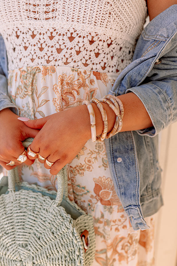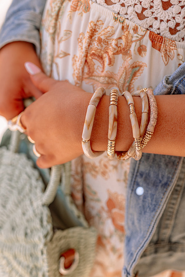 Add a pop of neutrality to your arm candy stack with our adorable 'Lucky To Have You Bracelet Set' featuring five taupe and gold stretch strands!