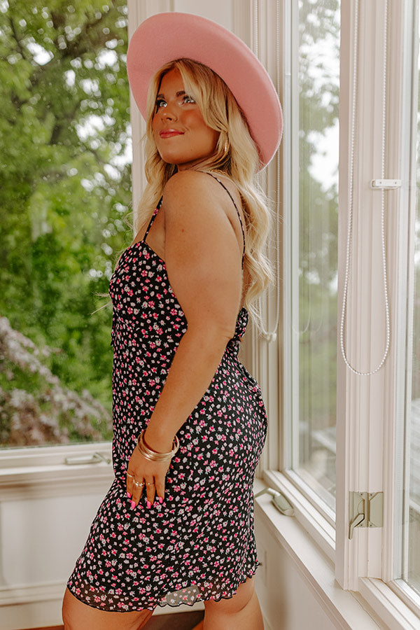 You are guaranteed to turn heads when you arrive in our darling black plus size 'Lush Garden' dress featuring lightweight material patterned with a small pink floral print, a sweetheart neckline with a front tie detail, adjustable spaghettis traps, and a flattering figure hugging silhouette that ends in a straight lower-thigh length hemline!