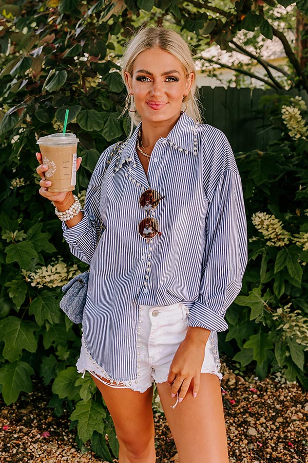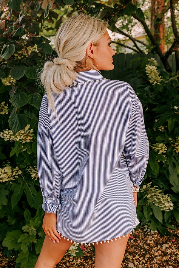 - A relaxed silhouette that ends in a rounded hemline with faux pearl embellished trim and accent side slits