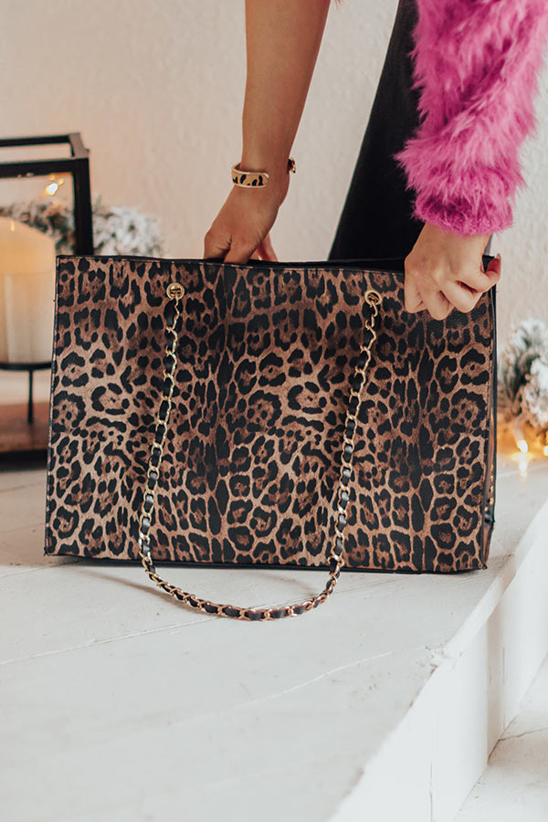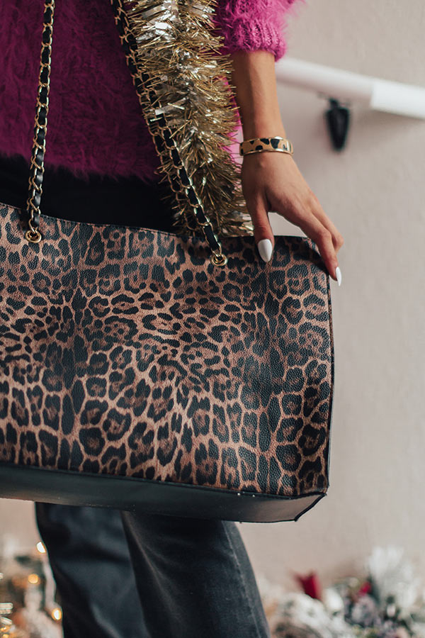 You will undoubtedly have a "luxe experience" when you accessorize with this stunning tote featuring faux suede material patterned with a bold brown and black leopard print, two chain link ribbon tote handles, gold stud accents, and a large spacious pouch with a button snap closure and additional inside pockets!