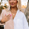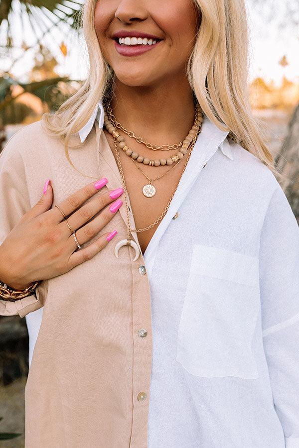 It will surely be a luxe fashion situation when you accessorize with this adorable necklace featuring four layered pieces: a chain link choker, a warm taupe colored beaded chain, a medium length chain with a gold coin pendant, and a longer dainty chain with a crescent faux bone charm!