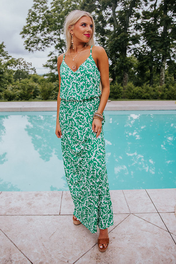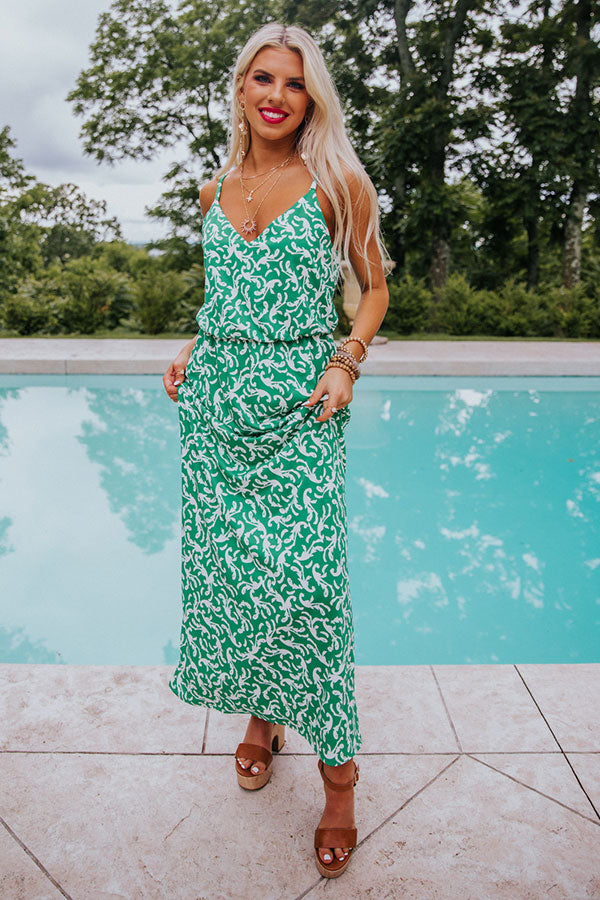 Dress to impress in our luxe 'Bungalow Maxi' featuring lightweight flowy material patterned with an emerald green hued floral print, a v-cut neckline and scooped back with spaghetti straps, a cinched waistline, and a relaxed but flattering skirt silhouette that falls into a straight ankle-length hemline! Measurements