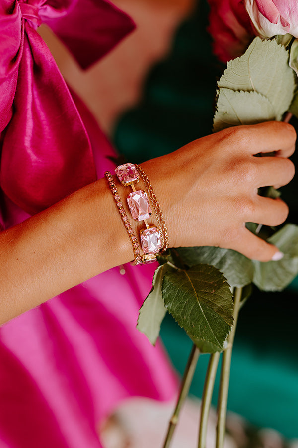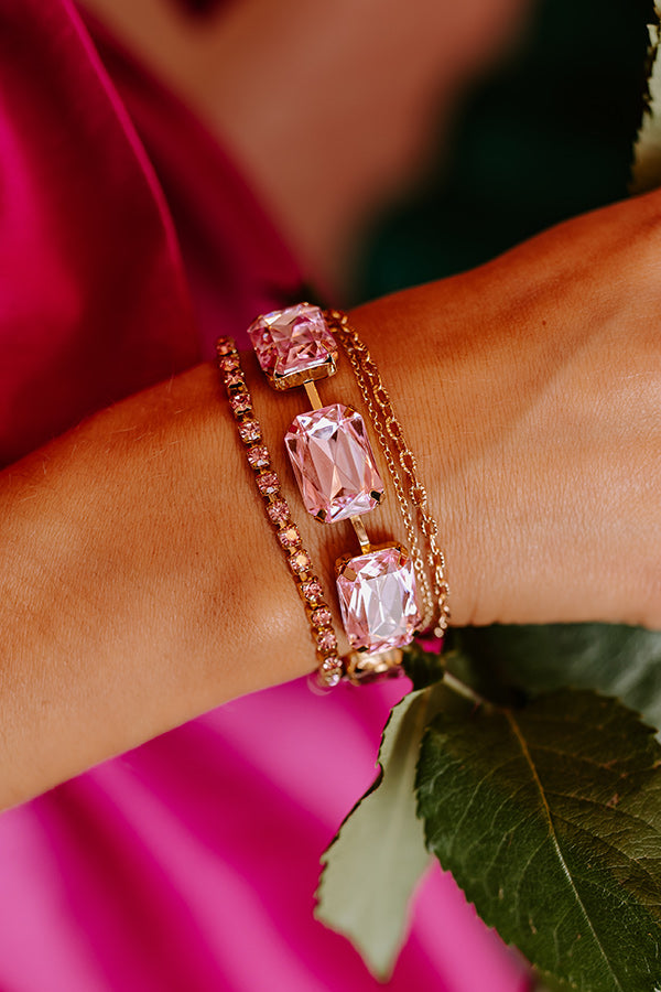 - This is a set of 3 gold toned bracelets with simmering pink rhinestones