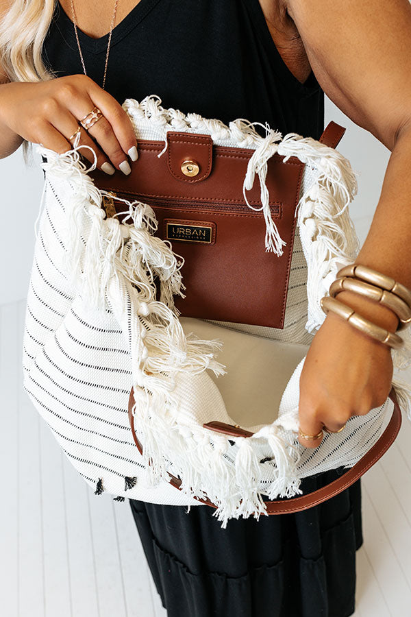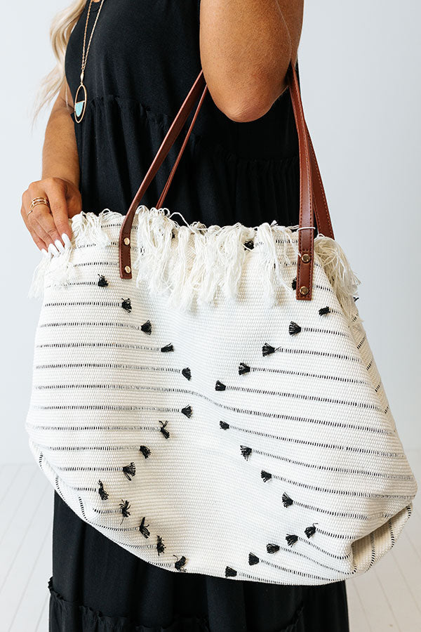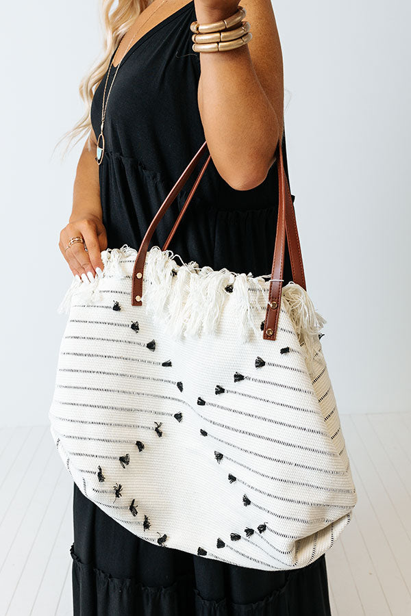 Perfect for carrying every essential you could possibly need, our white 'Made For Merriment' tote features lightweight canvas like material with black woven detailing, fringe tassel trim detailing, two faux leather tote handles, and a spacious interior with an additional snap closure pouch!