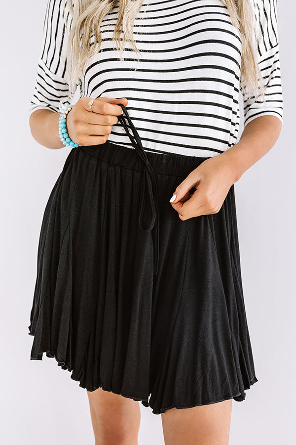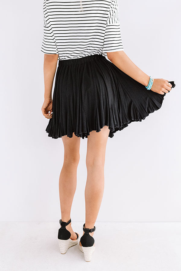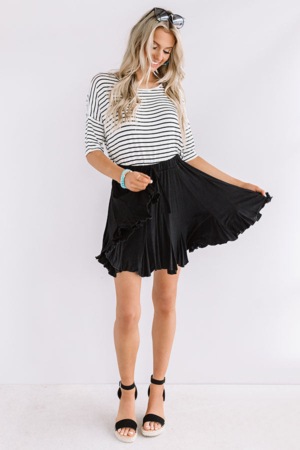 This adorable black skirt was made for dancing with its lightweight shift material, elastic waistband with a tie string closure, and ultra relaxed silhouette that falls into a ruffled mid-thigh length hemline! You can style this flirty piece a variety of ways, like with a basic striped top, sunnies, and black wedges, or you can wear it with a basic white tank, a distressed denim jacket, "The Everly Patent Heel in Natural" and our "CEO Material Faux Leather Tote in Iced Latte!" Measurements