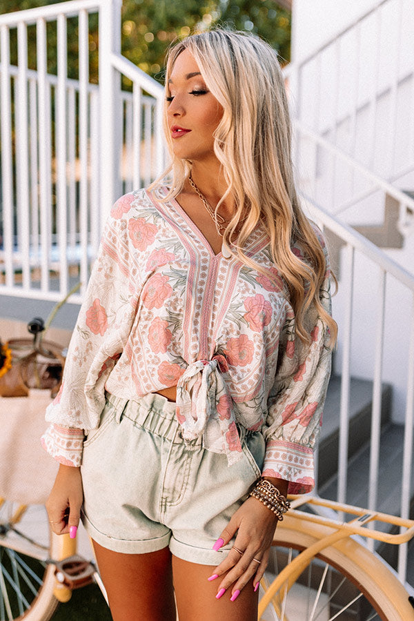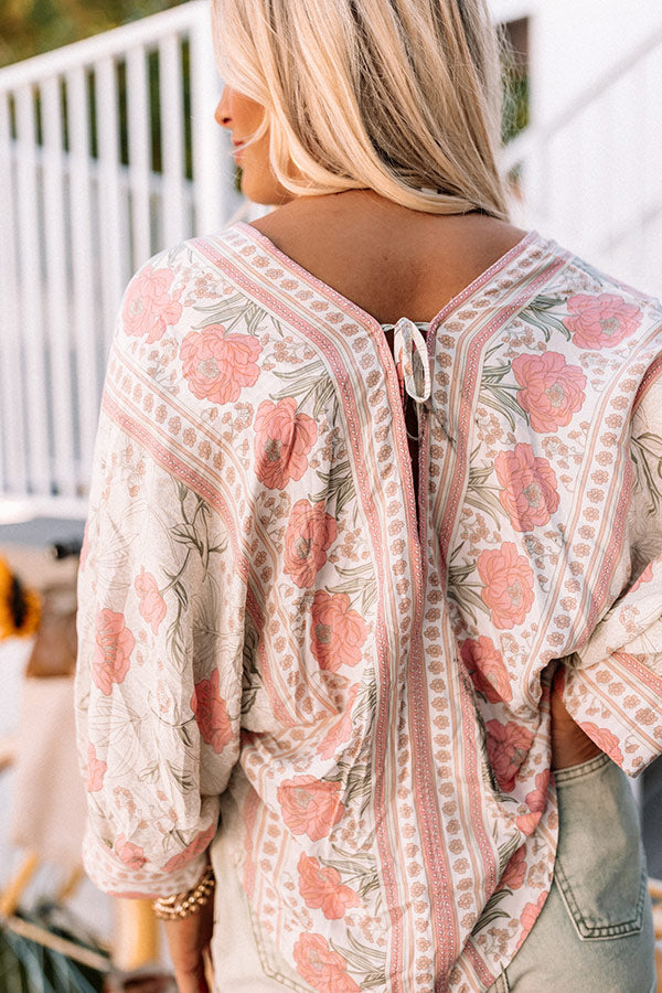 Your style is sure to blossom in our darling 'Magnolia Garden' top featuring lightweight material patterned with a pretty peach and pear hued floral print, a v-cut neckline and upper back with a tie closure, long loose sleeves, and a relaxed silhouette that falls into a tied front hemline!