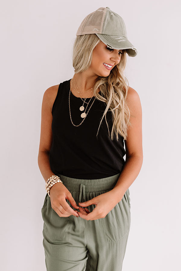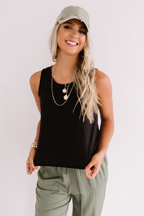 Achieve effortless style with our casual black "Main Character Tank" featuring soft lightweight breezy material, a scooped neckline, wide 2-inch sleeveless shoulder straps, a vertically ruched center back seam with a tie closure, and a relaxed silhouette that falls into a rounded hemline!