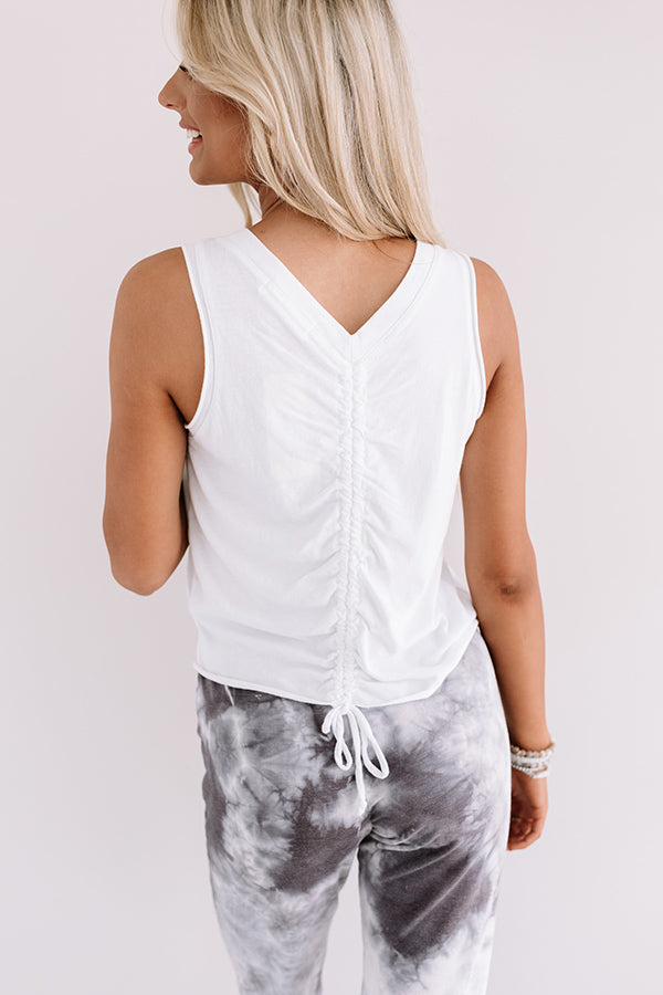 Achieve effortless style with our casual white "Main Character Tank" featuring soft lightweight breezy material, a scooped neckline, wide 2-inch sleeveless shoulder straps, a vertically ruched center back seam with a tie closure, and a relaxed silhouette that falls into a rounded hemline! This upscale basic can be worn a variety of ways, like with some trendy joggers, or it can be layered under a cropped jean jacket with some distressed black shorts, the "Mesh Slip on Sneaker," sunnies, and "The Essential Faux Leather Backpack in Black!" Measurements
