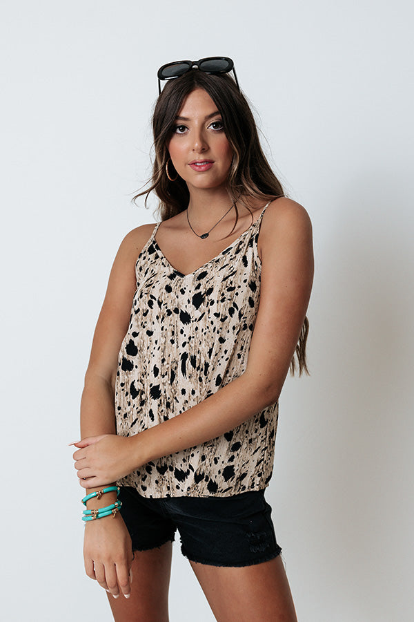 Upgrade your wardrobe's layering pieces with our chic light beige hued 'Main Street View Top' featuring lightweight material patterned with a black splattered print, a v-cut neckline with adjustable spaghetti straps, and a relaxed silhouette that falls into a straight hemline!